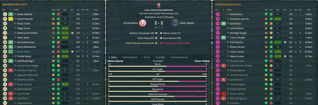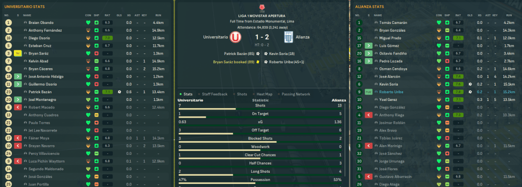 Universitario began the season with two away days. Rossi scored 30 seconds into his debut as Navarro and Wayttorn braces led a 5-2 thumping of Atlético Grau before homegrown striker Patrick Bazán’s brace downed newly promoted Llacuabamba 3-1. Their first home game was against rivals Alianza, who they haven’t beaten for seven years, which continued with a slightly unlucky 2-1 defeat with both goals coming from set piece breakdowns.