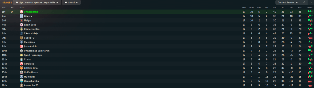 Bazán scored the winner in a 4-3 thriller at Ayacucho and Rossi bagged a hat trick as they crushed Cusco 7-2 before a disappointing 2-1 loss at Juan Aurich. Defender Robert Macedo became Universitario’s all-time record appearances holder in a 2-2 with San Martín, playing 268 games since coming through the academy in 2026. Macedo then scored a late winner at home to Lima rivals Cristal, which lifted Universitario right into the fight to win Apertura. With seven games remaining, Universitario sat three points behind Sport Boys and a 4-0 win at bottom-side Municipal saw them go joint-top with one point separating five teams in a tight battle for top spot.