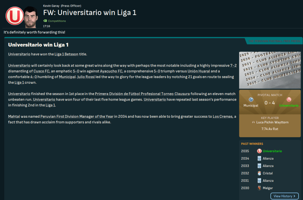 Despite the lack of a trophy celebration, that 1-0 win was enough to ensure Universitario were the deserving Champions of Peru!