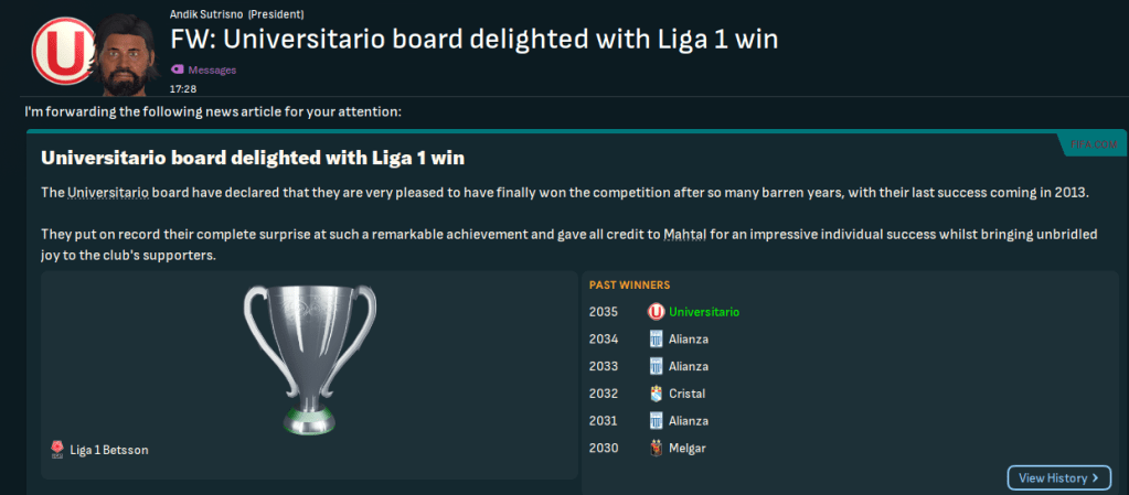 Mahtal led Los Merengues to a 2nd-place finish in Liga 1 in 2034, which was their best finish for six years. However, his ultimate aim was to restore the 28-time Peruvian champions to their former glory by winning their first league title since 2009.