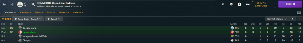 The run was likely to end there as Universitario drew 2033 runners-up Corinthians in the second round. And if they miraculously won that, they’d probably play River then Palmeiras. But there was no danger of that as they did well to only lose 2-1 at home then a rotated side lost 4-1 in Brazil.