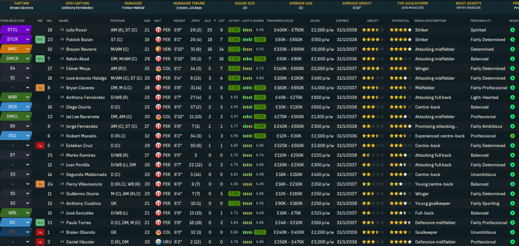 Mahtal was delighted at winning his first-ever national title, leading Universitario to the top of Peruvian football for the first time in 22 years. Rossi was an inspired signing, scoring 25 with 9 assists in 31 games. Youngsters pushed him close with Bazán scoring 19 with 7 assists and the promising Navarro scored 16 with 14 assists, while Abad led the way with 16 assists.