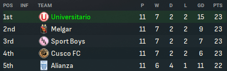 Universitario won Clausura by 1 point from Melgar but won the overall league by 4 points from the same opponents, with Alianza 2 points back in 3rd. They finished with 75 points after 22 wins, 9 draws and just 3 defeats, scoring 85 and conceding 38, and only conceded 12 in Clausura. Rossi was the third-top scorer with 21 in 25, Obando got the most clean sheets (10) and Abad got the joint-most assists (14).