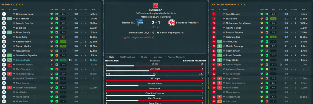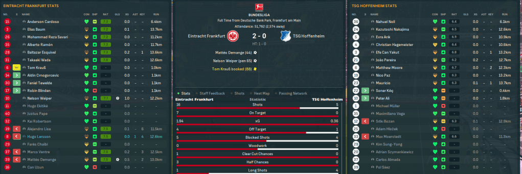 Mahtal’s first taste of top-tier European football saw three big games in a week. He began with a trip to Werder Bremen in which Frankfurt’s players were appalling, only had their first shot after 75 minutes and were lucky to lose 2-0. Next up was a trip to 8th-place Hertha, where they conceded the first shot but quickly levelled with Weiper’s penalty. Mahtal couldn’t believe what he was seeing as Hertha somehow scored their second shot and Frankfurt missed a host of chances and lost 2-1. That piled the pressure on for his first home game against 16th-place Hoffenheim, which they began better and took a deserved lead through winger Mattéo Demange. The lead was doubled as Larsson won a penalty that Weiper tucked into the top corner and Frankfurt eased to a much-needed 2-0 win that took them 5 points clear of trouble heading into a three-week winter break.