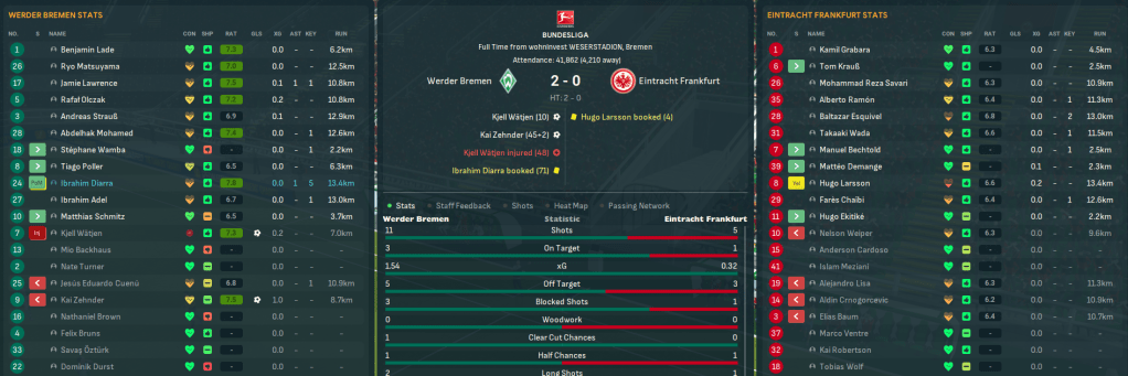 They continued to be strong at home, including Alonso creating both goals and Weiper scoring the winner to down Leipzig 2-1, but pretty average away. That home form moved Frankfurt to the verge of European qualification, and a 5-0 final-day win at relegated Karlsruhe secured 8th place, which saw them just miss out on the Conference League. They finished with 50 points after 15 wins, 5 draws and 14 defeats, scoring 48 and conceding 42. However, in Mahtal’s 21 games, they took 36 points with 11 wins. At the top of the league, Bayern reclaimed the title from Dortmund, who came 3rd and lost manager Niko Kovac to Newcastle, lifting their ninth title in 13 seasons during this save.