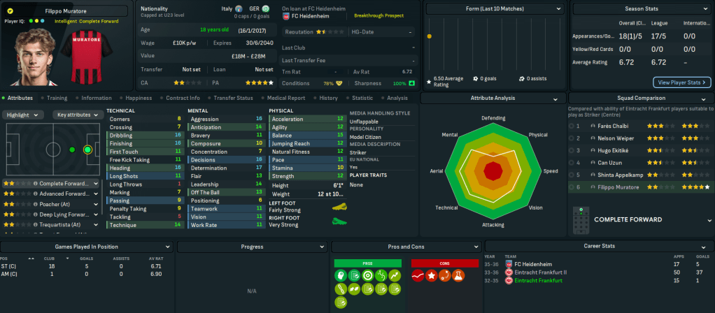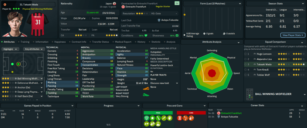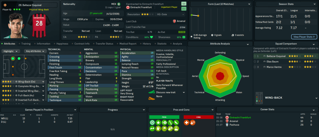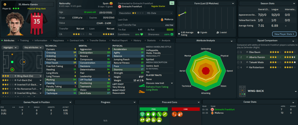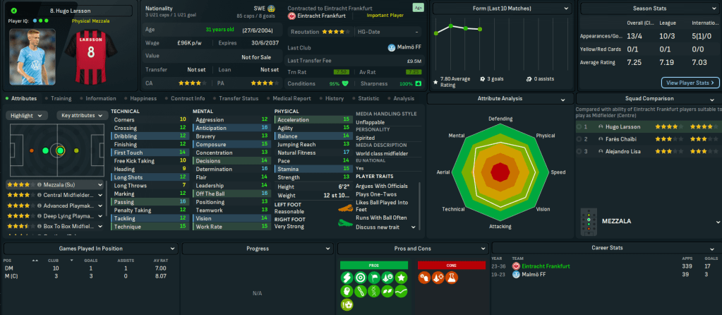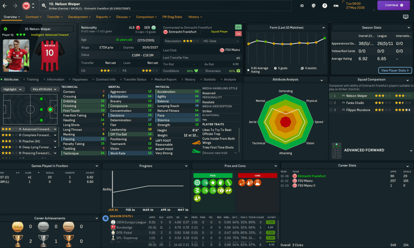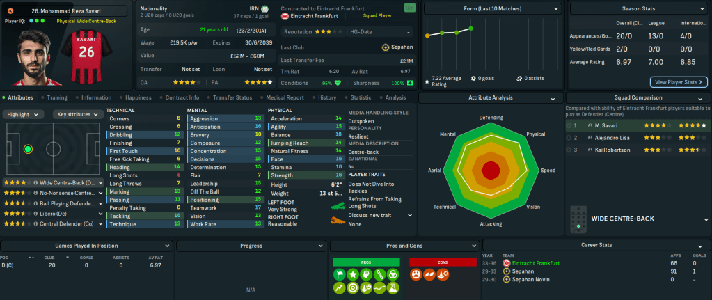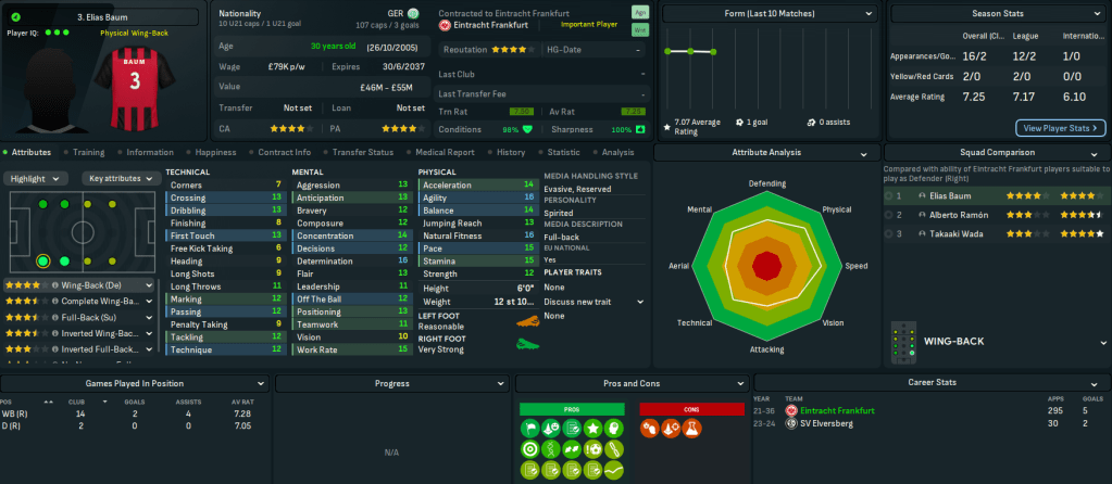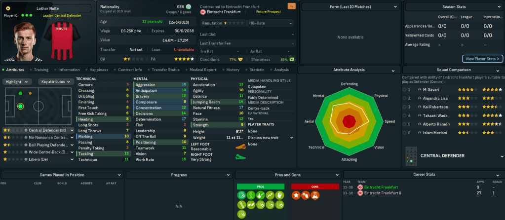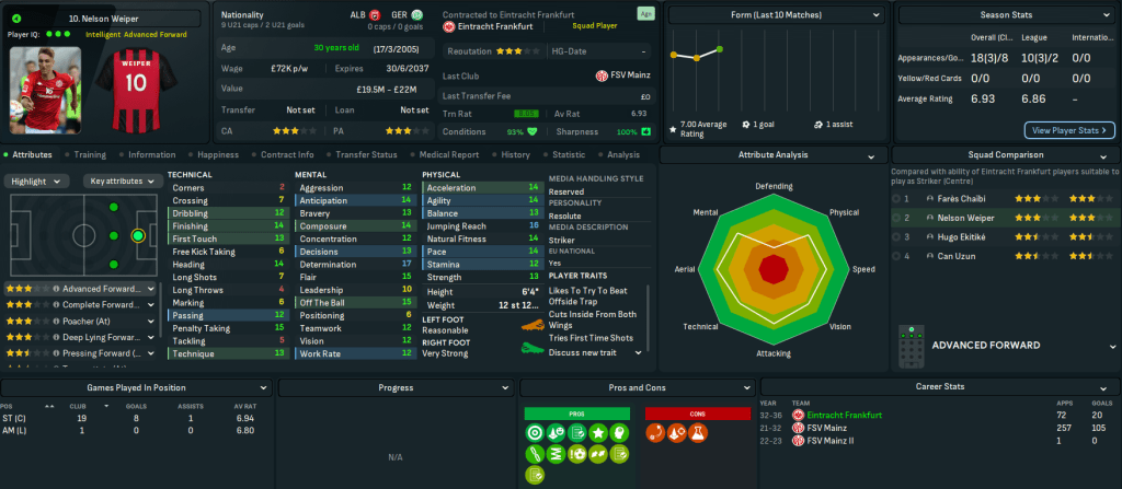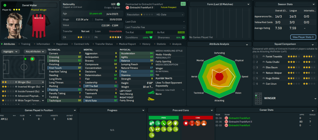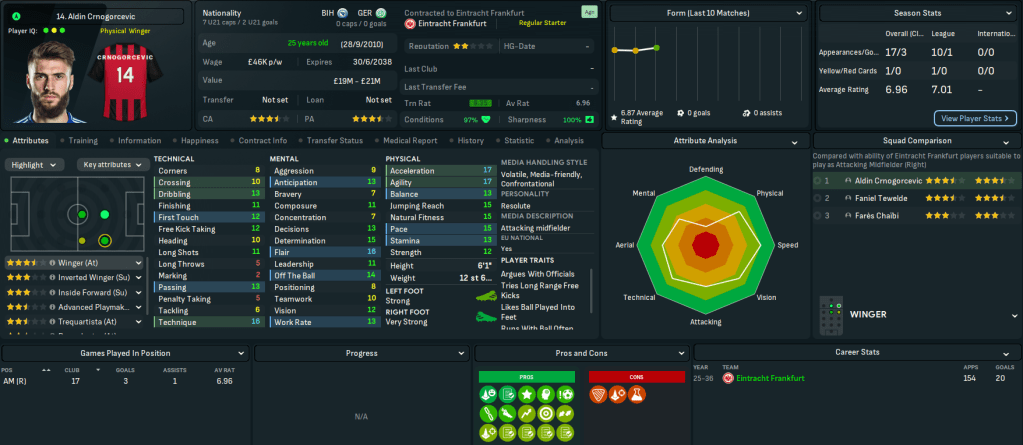 This move represents a massive step up for Mahtal, joining a club with a 4-star reputation and plays at the impressive 58,000-capacity Deutsche Bank Park. It also has 18 youth facilities, 17 training facilities, 14 youth recruitment and 13 junior coaching. However, it has a few financial issues with just £200k in the bank and overspending the £1.39m wage bill by £180k. Even more concerning, the club sits 14th in Bundesliga with just 4 wins and 14 points from their 13 matches.