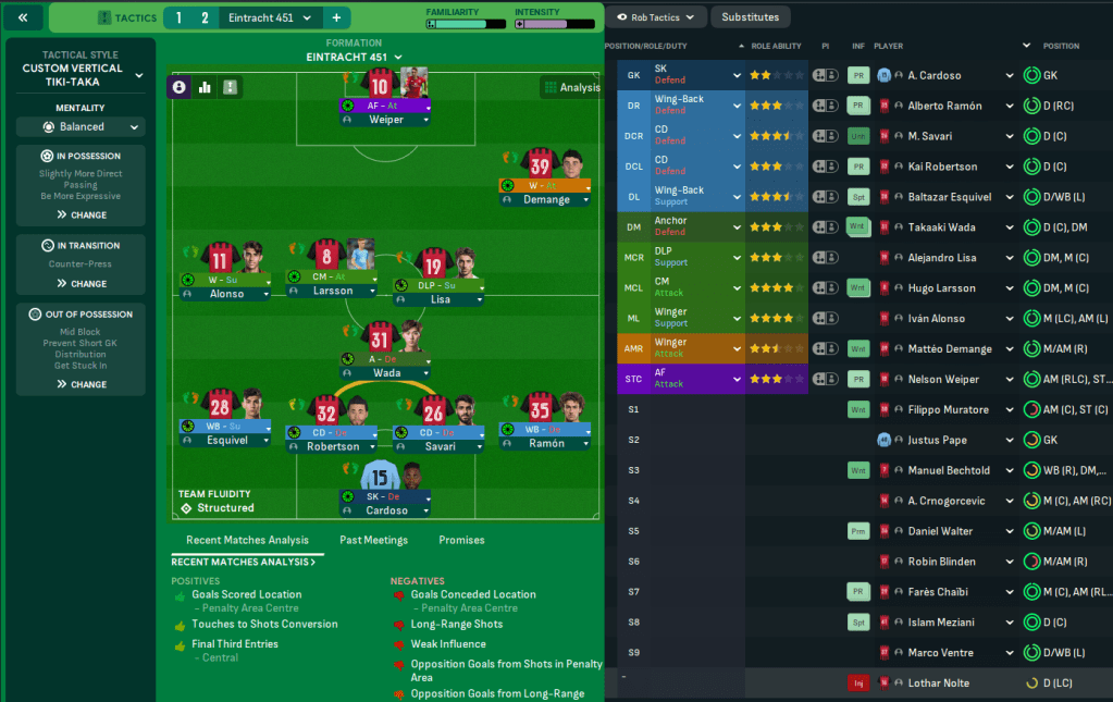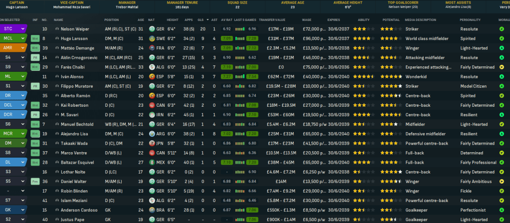 Mahtal was pleased with the impact he’d had at a struggling Frankfurt. He’d phased out some of the bad eggs and reduced the average age of the squad, but knew he still had plenty of work ahead. Weiper led the way with 20 goals in 43 games followed by Larsson (9) and Demange (7), while Lisa was the leading creative force with 8 assists and Alonso impressed with 3 goals and 7 assists in 16 games.