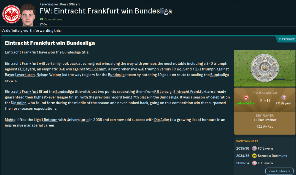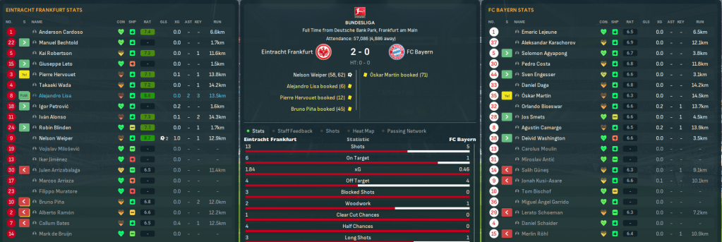 A big test of Frankfurt’s start was an early home game against Dortmund. Bates’ wonderful cross put the opener on a plate for Weiper and they bossed the first half without adding to their lead. Dortmund didn’t even get a shot on target but their keeper got MOTM as Frankfurt eased to a 1-0 win. And the flying start got even better as early Pina and Alonso strikes earned a comfortable 2-0 win at Leverkusen. The unbeaten run ended with a 2-0 defeat at home to Hamburg and Frankfurt trailed the mighty Bayern by a point heading into a huge clash in early December. Weiper forced a great save just before halftime but made no mistake when Alejandro Lisa’s pinpoint pass put him through after an hour. The same duo combined again four minutes later, and another stellar defensive effort held Bayern at arm’s length.