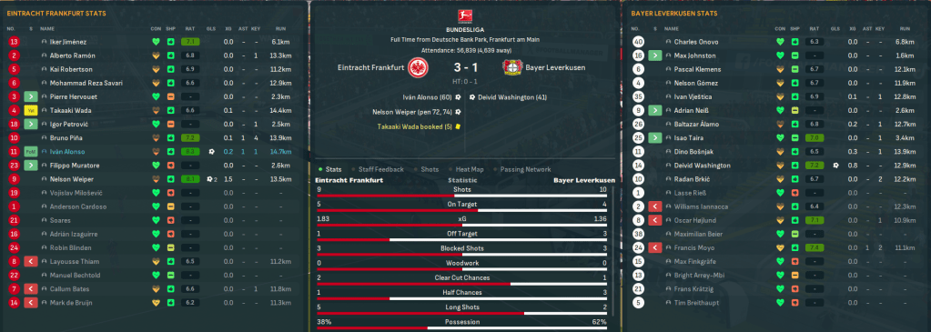 Game 1 – Bochum (15th, home): Alonso stepped up again to ease Frankfurt past Bochum, creating the opener for homegrown wonderkid attacker Filippo Muratore and scoring the third in a 3-0 win. Leipzig drew 0-0 at Wolfsburg and 10-man Bayern lost 3-0 at 5th-place Hamburg, so Frankfurt moved 5 points clear with four games remaining.