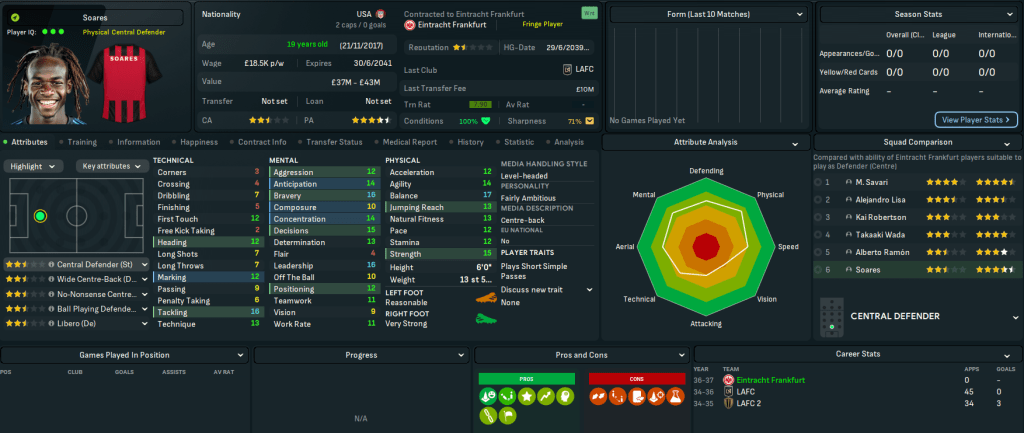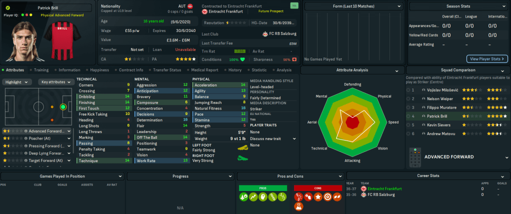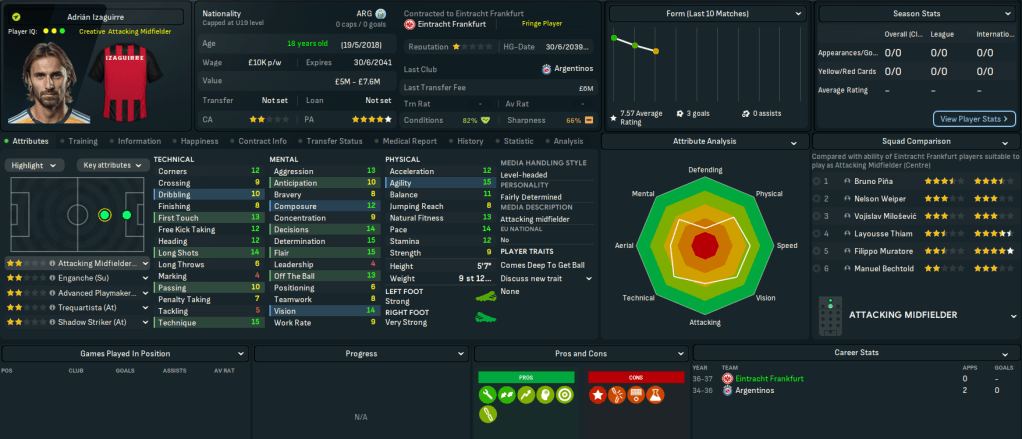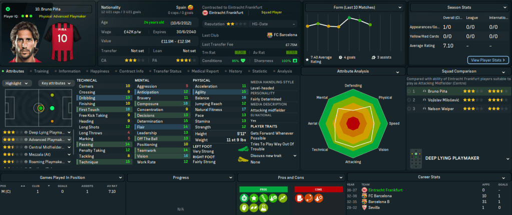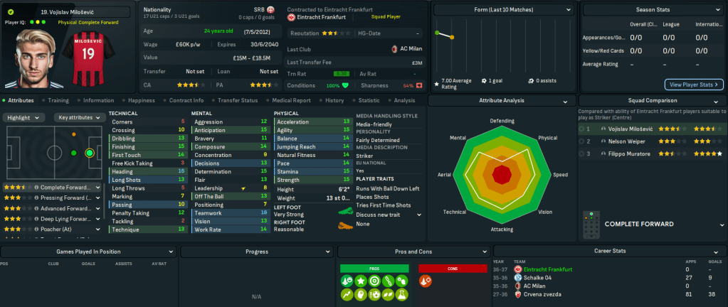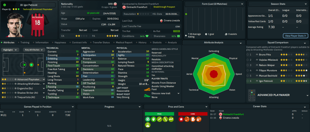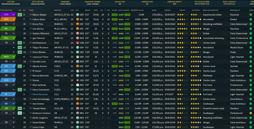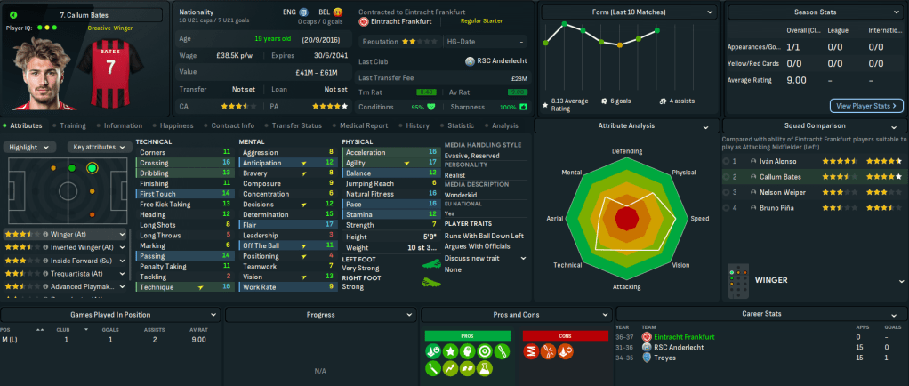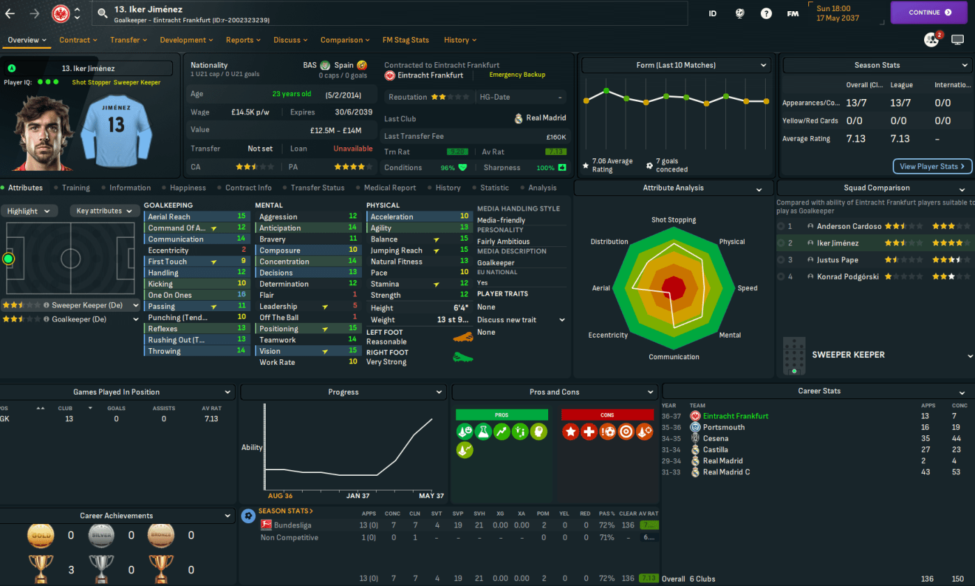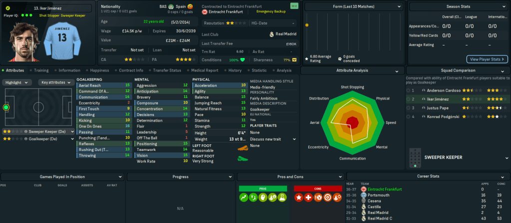 Mahtal knew he’d done a decent job at rebuilding the Frankfurt squad, but certainly wasn’t expecting this success in his first full season. They had some serious talent in this squad with a huge amount of potential in the likes of Alonso, Bates and Petrovic and a really solid defence, but he wasn’t quite sure how they’d managed it! Weiper led the way with 19 goals in 35 games, but Mahtal’s wing additions Bates and Alonso made the difference with 9 goals and 10 assists and 6 goals and 11 assists respectively. However, an unsung hero was Jiménez, who came into the team late in the season and steadied the ship with the club’s best average rating at the club of 7.13. He kept 7 clean sheets and only conceded 7 goals in his 13 league games.