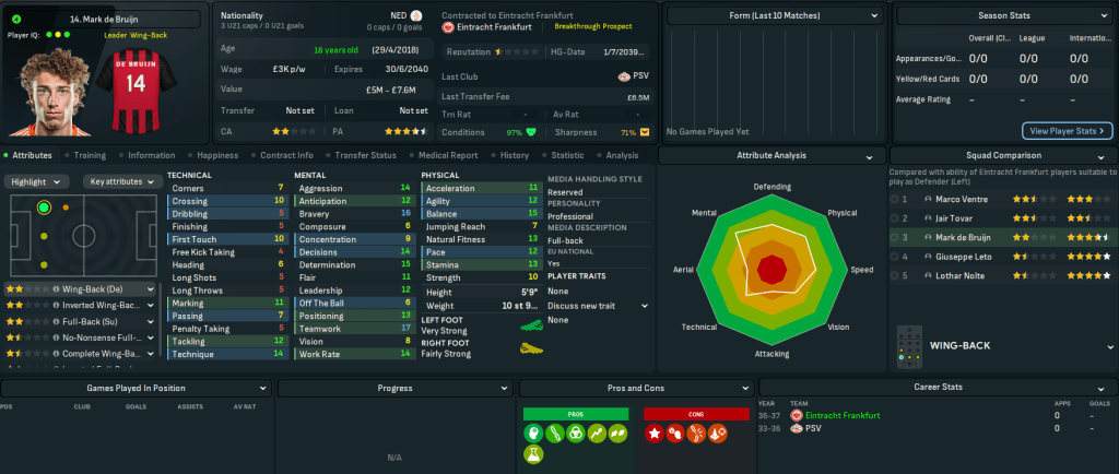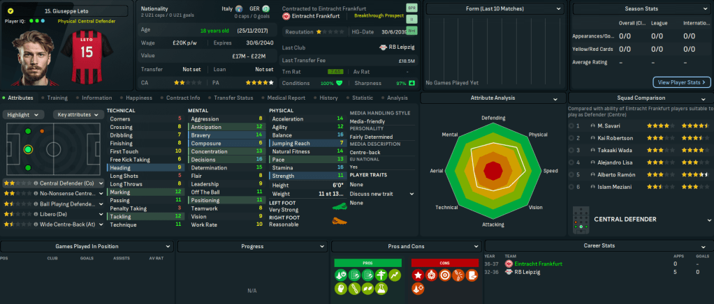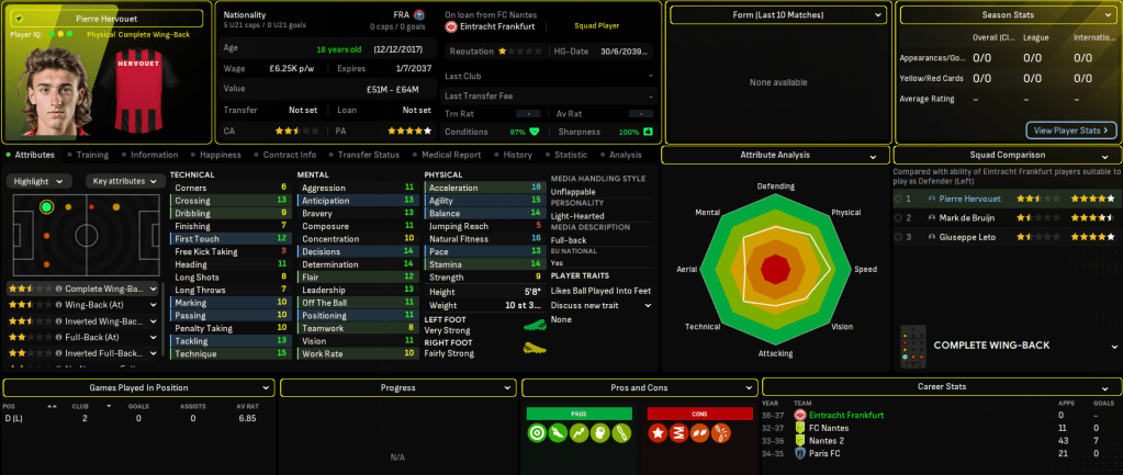 Indeed, Frankfurt began the summer of 2036 with £74m in the bank, a £21m transfer budget and £400k of its £1.4m wage budget spare. But that was boosted by another £130m in sales. First up, long-serving midfielder Hugo Larsson going to Saudi for £45m a year before his contract expired and out-of-favour midfielder Aldin Crnogorcevic joining Leipzig for £18m. More annoyingly, they lost left back Baltazar Esquivel to Milan for his release fee of £47.5m.