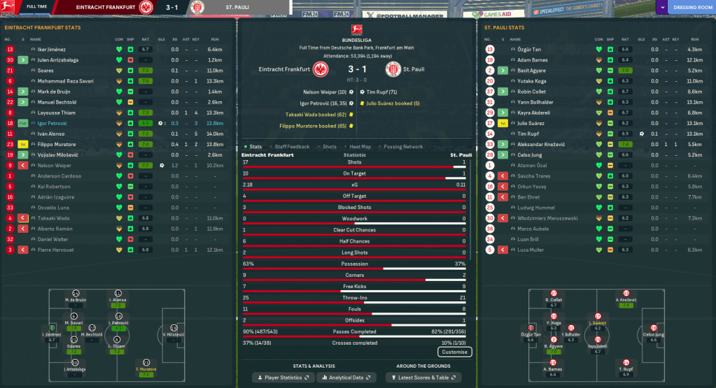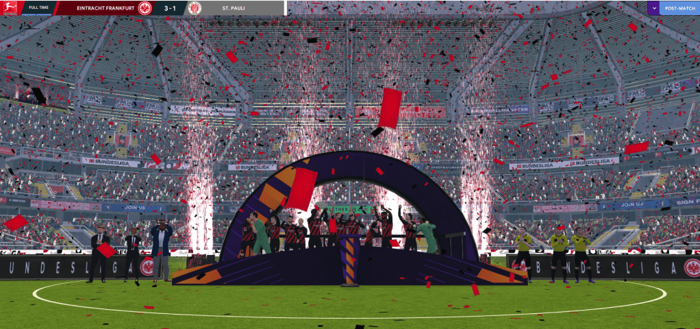 Game 5 – St. Pauli (11th, home): Frankfurt knew a win would seal the title and started well as Weiper thundered home a header from Thiam’s corner on 10 minutes. And they were swiftly 2-0 up as Muratore slid Petrovic in to calmly pass the ball into the bottom corner. Weiper missed two more big chances before Petrovic collected the ball at the corner of the box and curled a beauty into the top corner. And they led 3-0 at halftime after 12 shots to zero. They somehow allowed St. Pauli to score from their only attack, but they eased to a title-winning 3-1 victory.