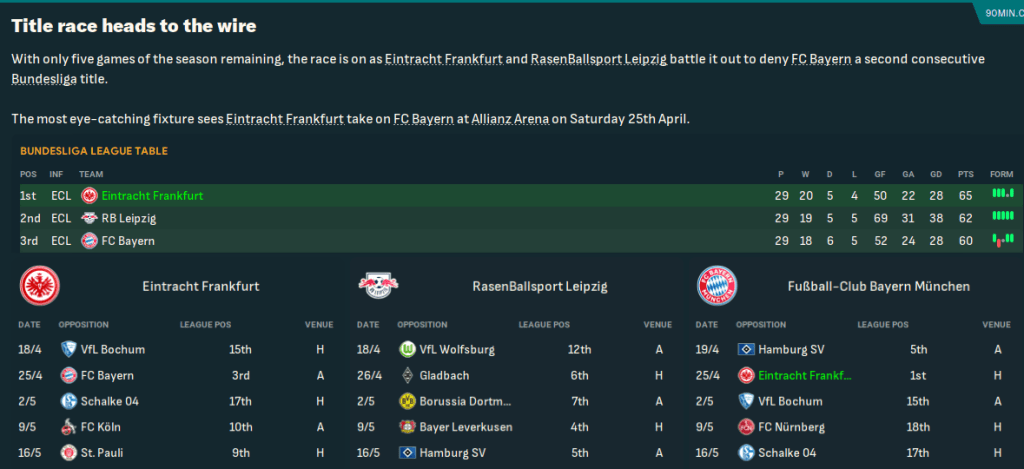 That saw Frankfurt head into a three-way title fight, leading Leipzig by 3 points and Bayern by 5 points with five games remaining. Both Frankfurt and Bayern had three easier games but it could be decided by Frankfurt’s visit to Bayern in gameweek 31.