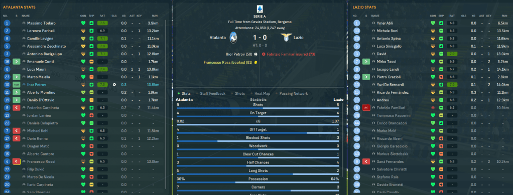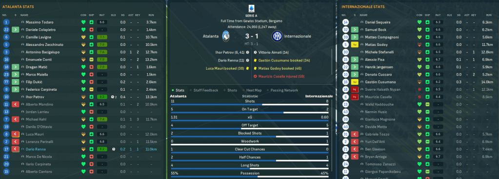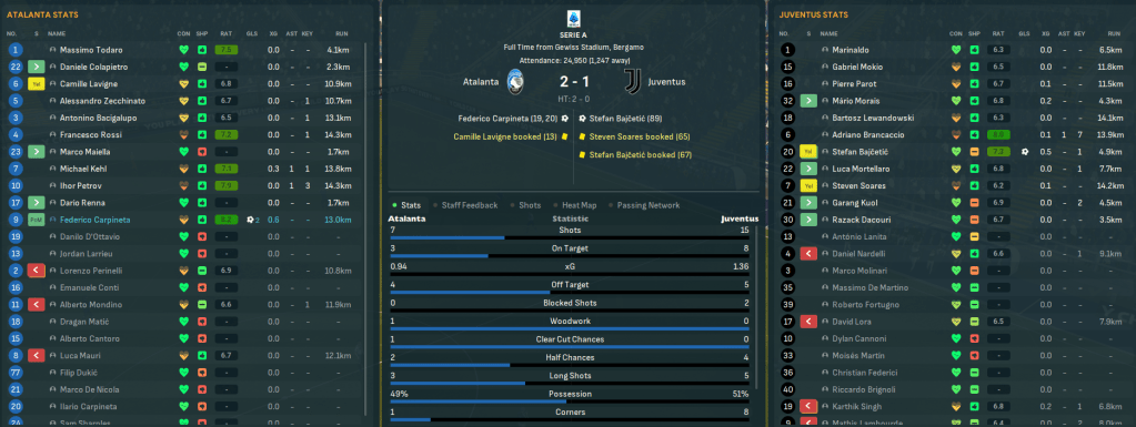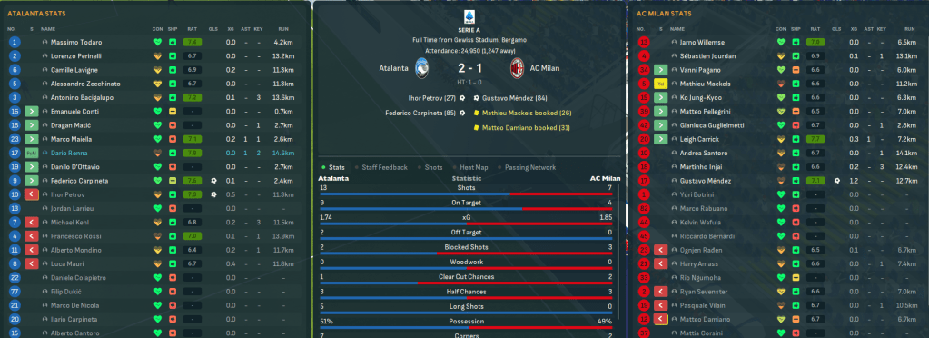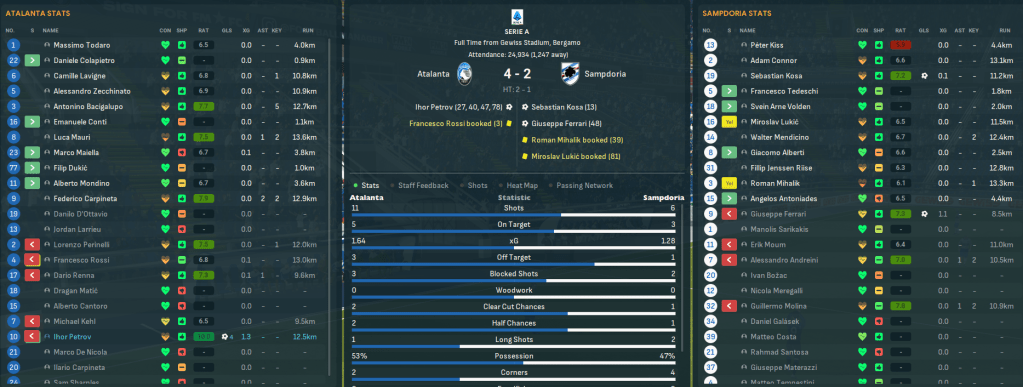 Kehl and Renna scored again to earn a point at Torino before two huge games in a week. First up, they faced relegation favourites Sampdoria and got battered for the first 25 minutes, but two moments of brilliance saw Carpineta tee up Petrov to put them in front. Petrov wrapped up his hat trick 75 seconds after the break, only to immediately concede again, but the Ukrainian secured all three points with a ludicrous 30-yard chip. A week later, they entertained Juventus, who’d courted Mahtal over the summer before appointing Sergio Conceicao. The visitors started strongly, but Petrov laid on Carpineta’s first of the season and, straight from kickoff, Kehl won the ball back and sent the striker in for his second. Atalanta defended well before letting in a late goal but held on for a huge 2-1 win.