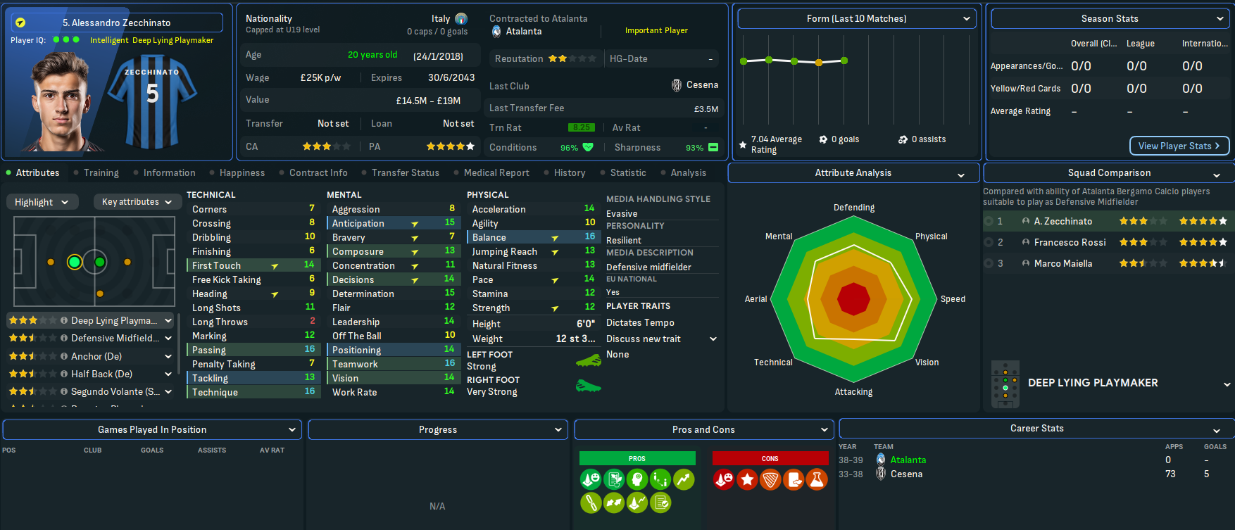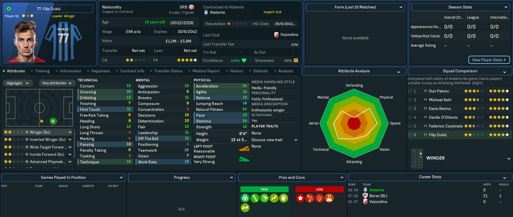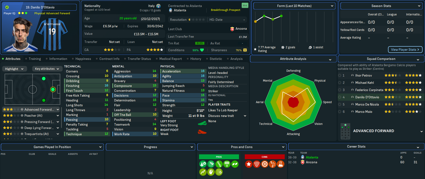Indeed, the Atalanta board announced they had cleared the club’s debts and handed Mahtal a £20m transfer kitty and a £672k wage budget. Mahtal was also now finally able to scout and buy players. But his first move of the summer was to lock his best young players down to new deals, which left them with only £100k spare in the wage budget. He also spent time rebuilding the coaching staff, while the board agreed to requests to improve youth recruitment and the training facilities.