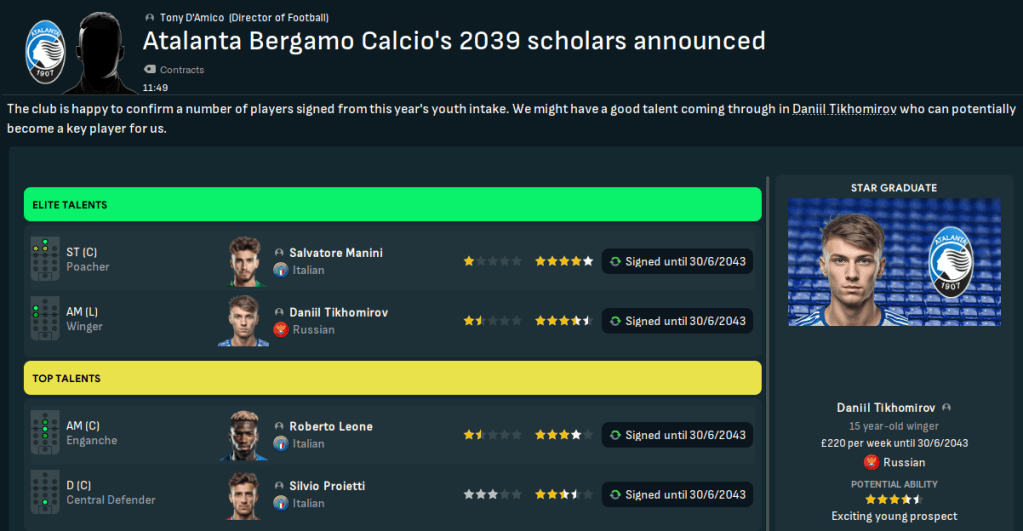 Homegrown star Mauri made his Italy debut in March and Kehl came 2nd in NxGn 2039, with Perinelli 18th, Colapietro 22nd and Matic 47th. So the future of this club was certainly bright. And it became even brighter with a youth intake led by 5-star potential talents striker Salvatore Manini and Russian winger Daniil Tikhomirov.