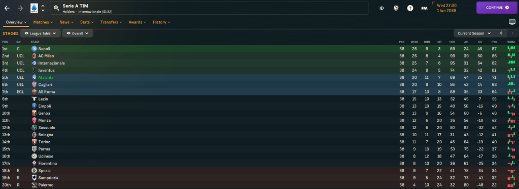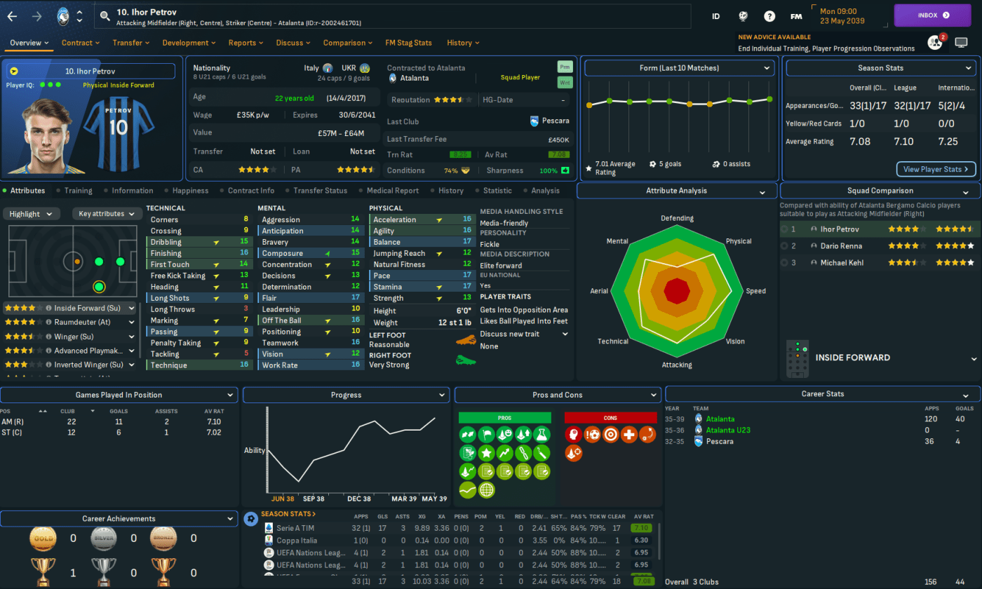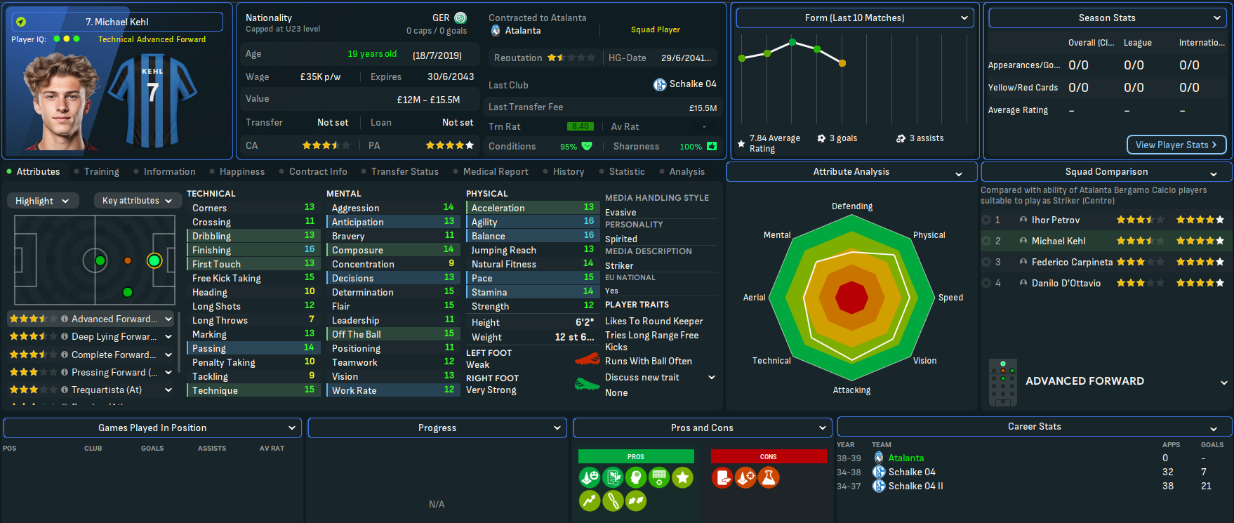 Mahtal knew his Atalanta squad was brimming with potential but didn’t expect them to finish 5th in Serie A! Indeed, in their first season back in the top tier, Atalanta had beaten Juve, Inter and AC Milan at home, and only lost once at home all season (against Roma). Some of his young players had stepped up big-time this season, led by newly-monikered elite forward Petrov. The Ukrainian topped their scoring chart with 17 in 34, but Kehl was arguably their best player with 11 goals, 14 assists and a 7.13 average rating. Carpineta finished the season well as he got 9 goals and 8 assists, Mondino got 9 goals and 9 assists and Renna got 9 goals and 7 assists. However, all of these players were attracting the interest of Europe’s elite ahead of the summer transfer window.