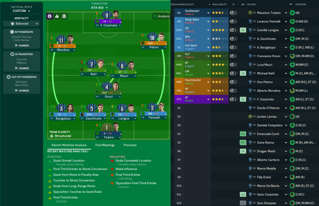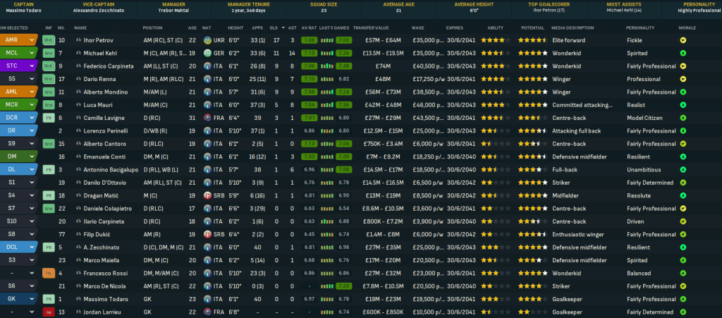 Mahtal was a little nervous about throwing his youngsters into Italy’s top tier, but confident the experience would help them realise that potential. Given the step up, he decided to stick with the 4-3-3 approach he’d brought in at the end of last season, but with a few cautious tweaks to the instructions. Star player Ihor Petrov has moved out to the right, giving wonderkid striker Federico Carpineta the massive responsibility of leading the line, with Kehl and Zecchinato coming into the midfield and defence.