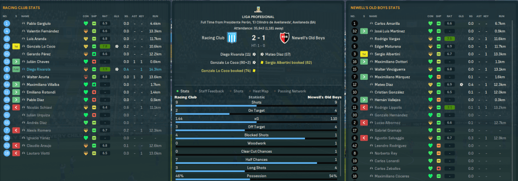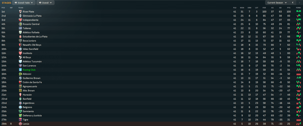 That was backed up by Rivarola scoring twice in a 4-3 thriller at Banfield, who scored twice in injury time to make it look respectable. But a big test of their credentials came at home to leaders River Plate, who won a poor game 1-0 with a very dodgy penalty to win the league title. Racing won 2-1 at All Boys on the final day to secure a pretty solid 10th place, level on points with Boca Juniors but a huge 26 behind champions River.