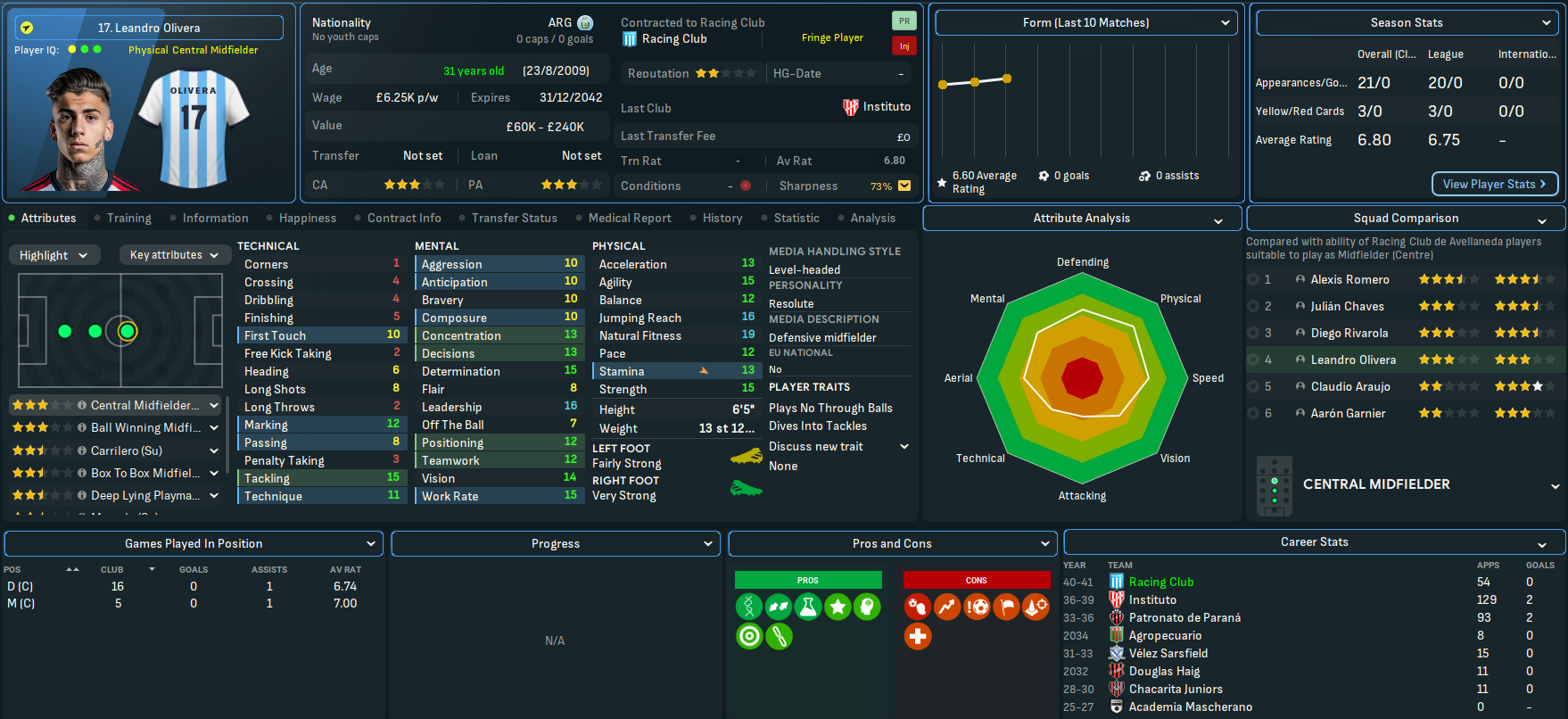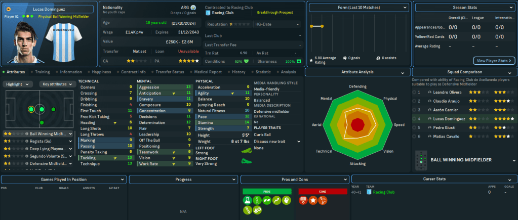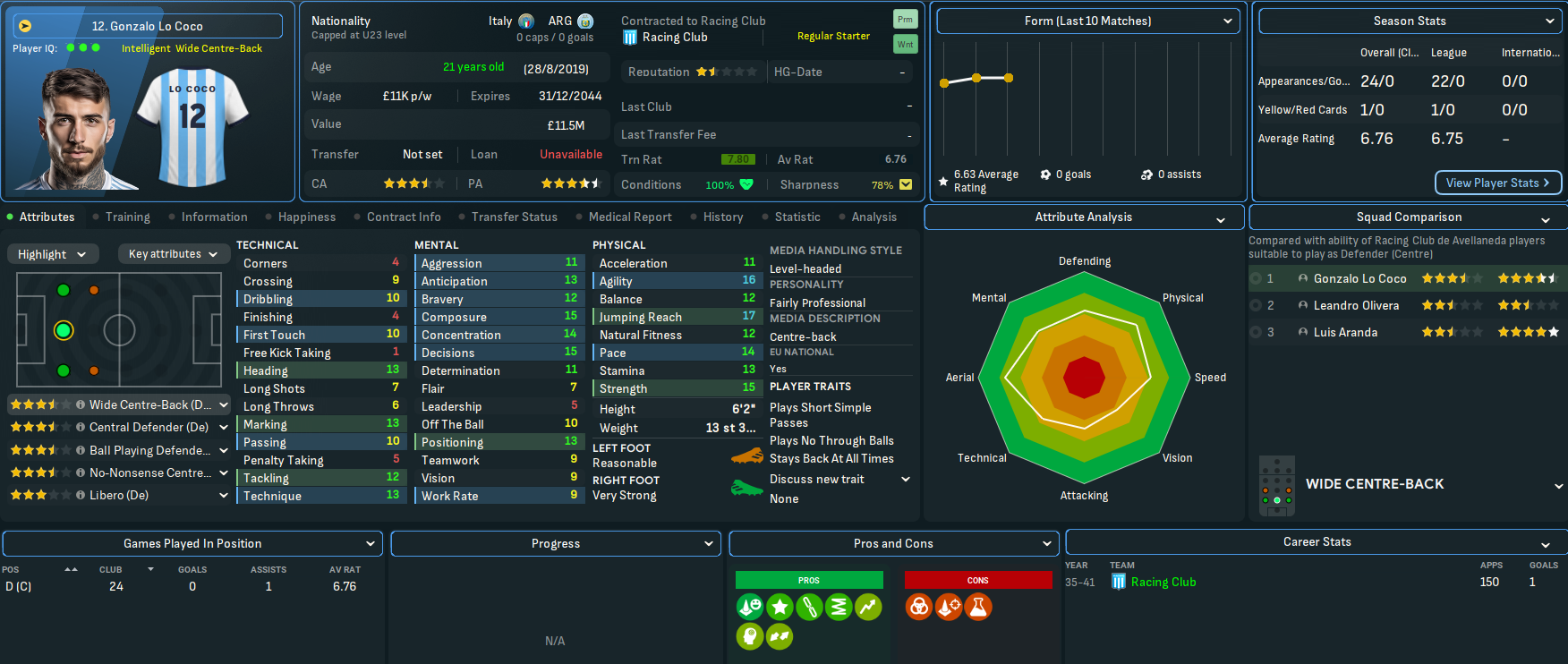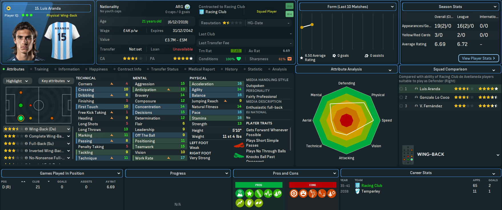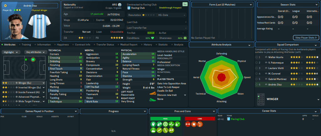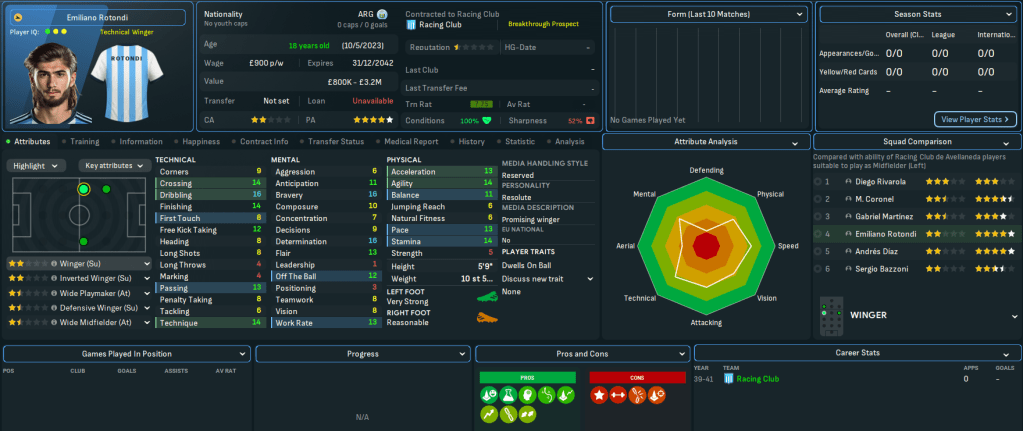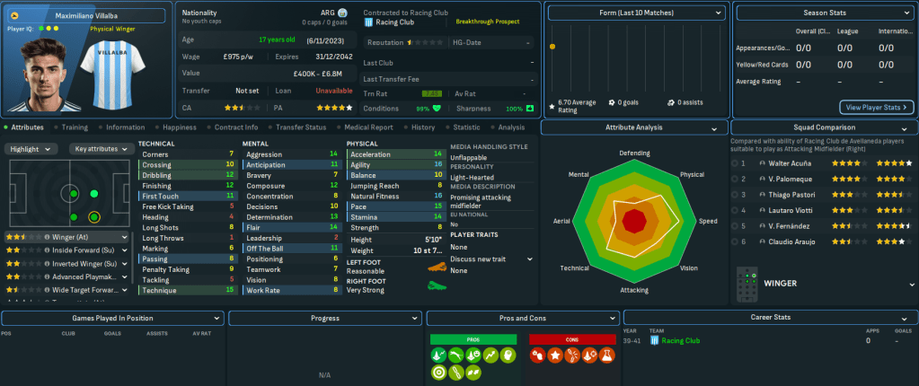 Racing play at the impressive 51,389-capacity Presidente Peron ‘El Cilindro de Avallaneda’ and having solid infrastructure of 19 youth recruitment, 18 junior coaching, 12 training facilities and 11 youth facilities. It also has a 4-star reputation but isn’t doing so well financially, with the club £1m in the red and £45m of net debt and spending £150k over the minuscule £91k weekly wage budget. Despite those positives, Mahtal walked into a nightmare with masses of players wanting out or demanding new contracts that the club couldn’t afford then mass mutinies when he didn’t sell certain players or didn’t offer contracts to others. So he was forced into a mini clearout that saw 23 players depart for a profit of around £26m, which at least allowed him to stop the club overspending on wages.