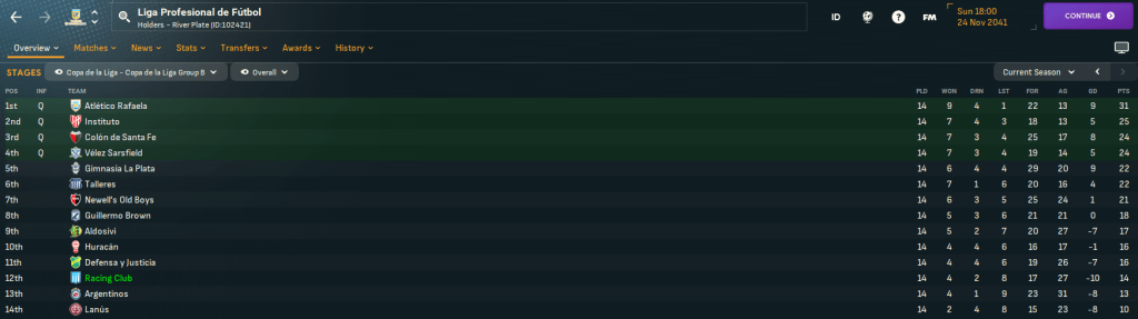 Racing Club is historically recognised as one of the “big five” of Argentinian football, along with Boca Juniors, River Plate, San Lorenzo and Independiente. It was the first club in the world to win seven successive league titles and the first Argentinian club to become world champion. It won its first national title in 1913 and has gone on to win 17 more, the most recent in 2019. It also became champions of South America by winning Copa Libertadores in 1967. Racing have added two more titles during this save, winning the Argentinian title back in 2027 and Copa Libertadores in 2026. However, it’s struggled of late, finishing in a lowly 22nd in 2039, then 5th and 6th, and currently sits 13th after 23 games of the 27-game Liga Profesional de Fútbol.
