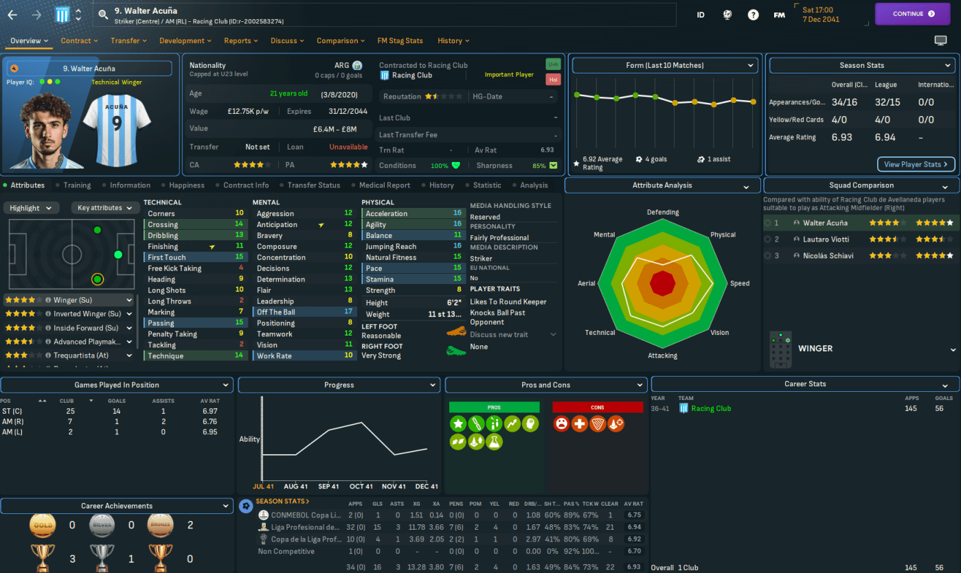 Racing Club is historically recognised as one of the “big five” of Argentinian football, along with Boca Juniors, River Plate, San Lorenzo and Independiente. It was the first club in the world to win seven successive league titles and the first Argentinian club to become world champion. It won its first national title in 1913 and has gone on to win 17 more, the most recent in 2019. It also became champions of South America by winning Copa Libertadores in 1967. Racing have added two more titles during this save, winning the Argentinian title back in 2027 and Copa Libertadores in 2026. However, it’s struggled of late, finishing in a lowly 22nd in 2039, then 5th and 6th, and currently sits 13th after 23 games of the 27-game Liga Profesional de Fútbol.