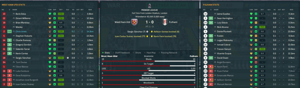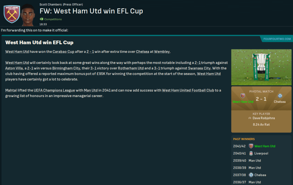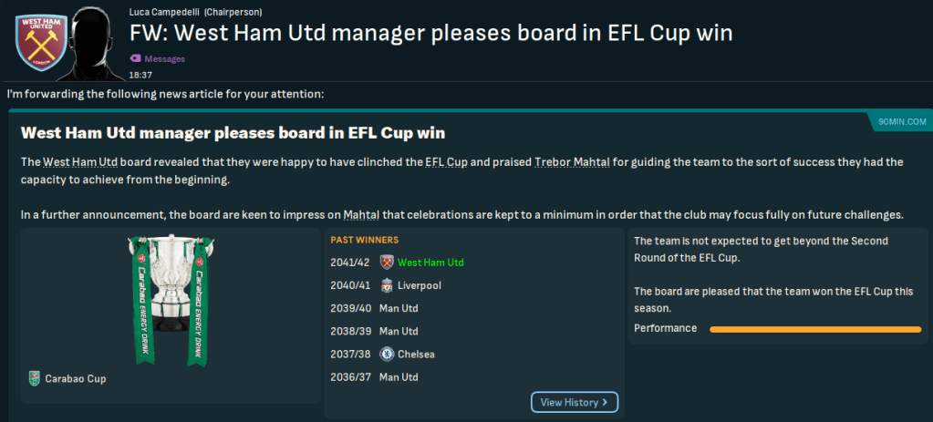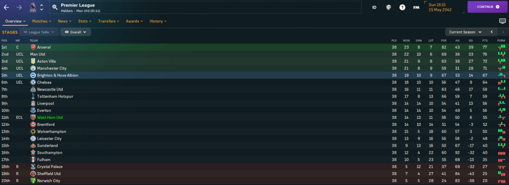 The club won the inaugural Football League War Cup in 1940 and has gone on to win five major honours, with three FA Cups in 1954, 1975 and 1980, the Cup Winners’ Cup in 1965 and the Conference League in 2023. West Ham hasn’t come close to adding to those honours during this save, not finishing higher than 7th in any season. Moreover, it’s not finished in the top half of the Premier League since 2036, finishing 15th for the last two season, and not gone beyond a cup quarter-final during the save.