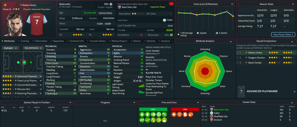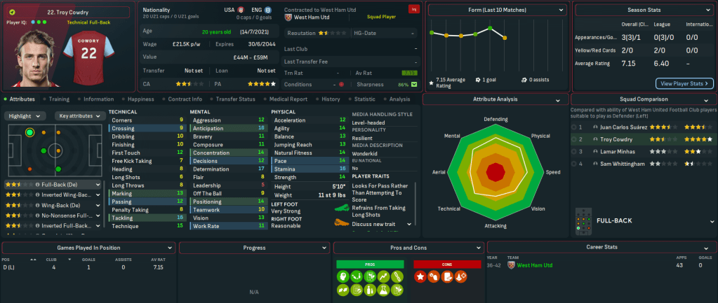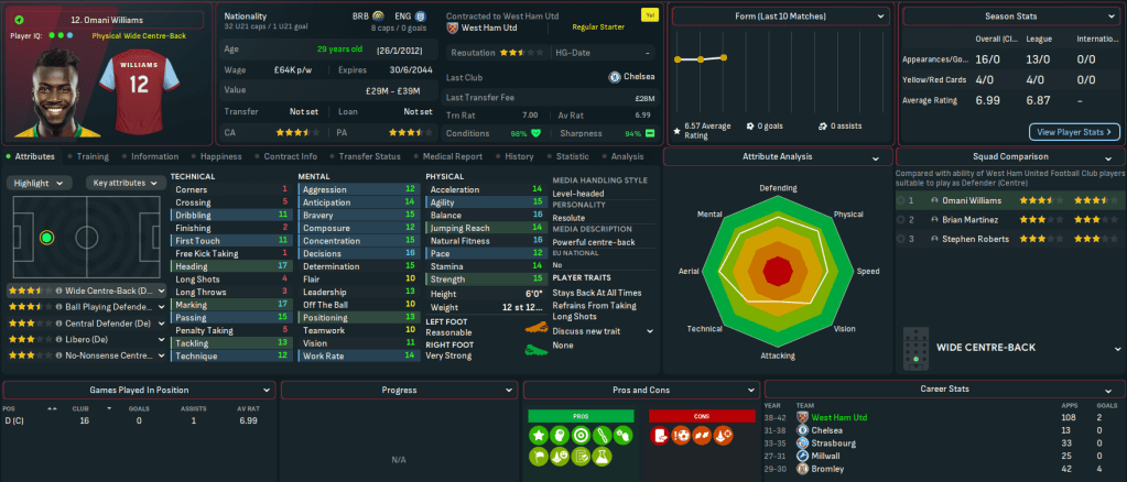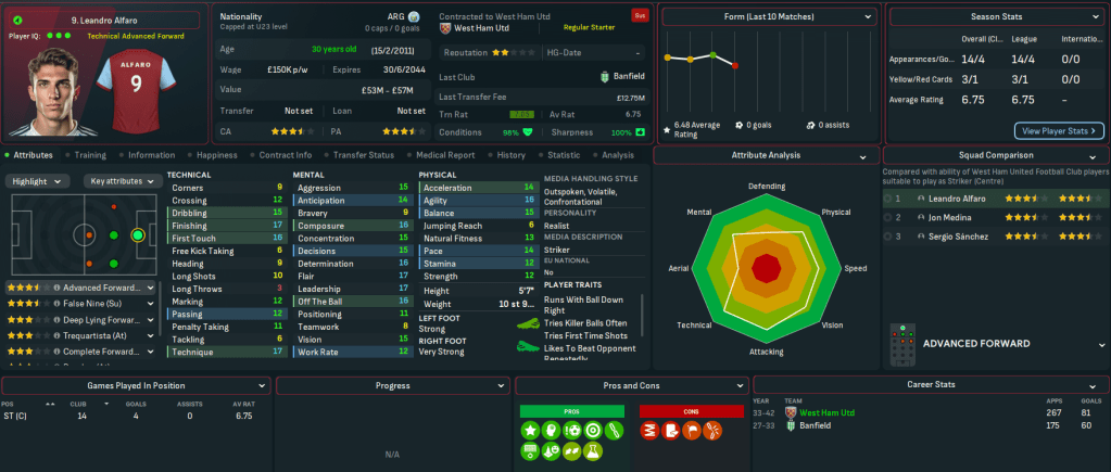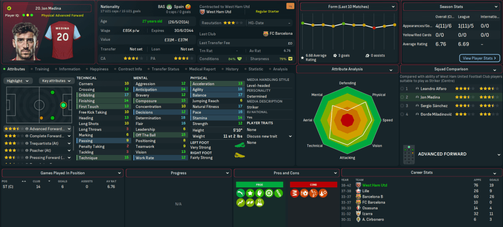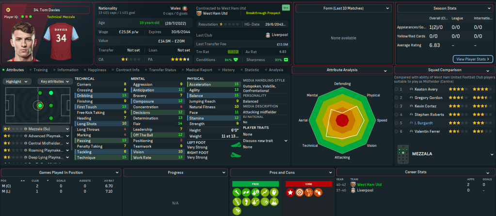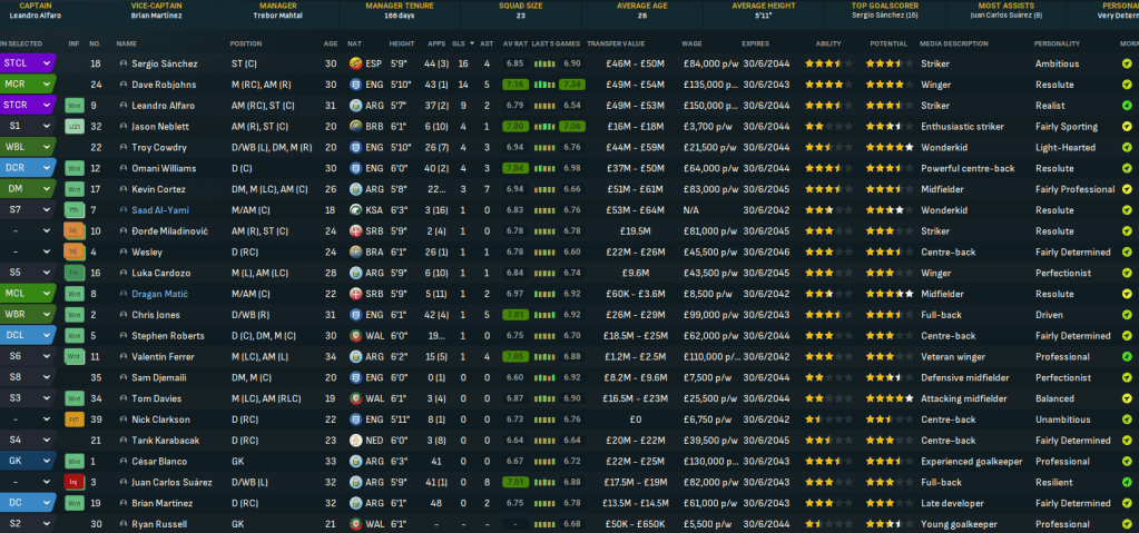 Mahtal walks into a club that was in more of a mess than he realised. It’s currently 17th in the league with 13 points and 3 wins from 14 games, just 2 points ahead of 18th-place Crystal Palace. But it’s still in the Carabao Cup, with a quarter-final coming up. The biggest challenge though was financial, as the AI’s inability to manage finances shone through yet again with West Ham a massive £136m in the red and facing £156m of net debt. Mahtal has a transfer budget of just £4.3m and a £2.5m weekly wage budget, of which £2.4m was being spent.