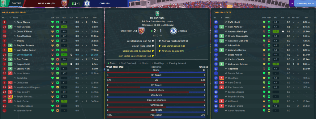 A week after Mahtal’s appointment, he faced a Carabao Cup quarter-final at Aston Villa. His cautious approach worked well as Robjohns nicked a 2-1 victory, which was rewarded by a semi-final clash with Championship side Rotherham while Chelsea played Everton. West Ham eased to a 3-1 away win and Sánchez scored the only goal at home to send West Ham into an unexpected cup final.