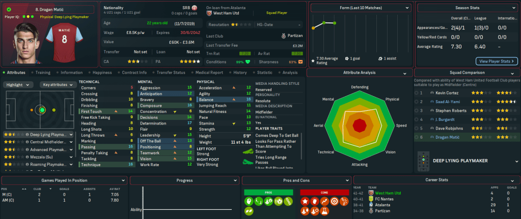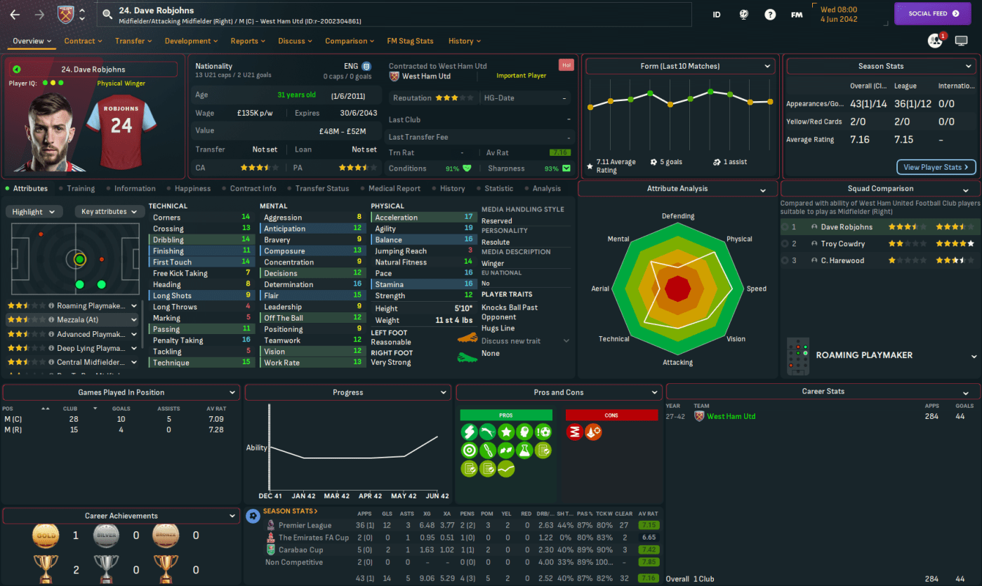 Mahtal’s solid start had seen West Ham climb to 15th, 7 points clear of the dropzone heading into 2042. He wasted no time selling players when the window opened, with underperforming midfielder Gregory Gordon going to Porto for £53m and goalshy Medina to Torino for £37.5m, before Avery forced a £69m move to Man City. He brought in a total of £144m, slashing £600k off the wage bill, but the club remained £48m in the red. And he added to the squad with loans, bringing in his former Atalanta midfielder Dragan Matic and Saudi wonderkid Saad Al-Yami.