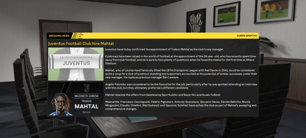 The biggest managerial news of the summer was Pep Guardiola departing Man City after a phenomenal 27 years at the club. But, of course, Mahtal couldn’t apply as he’d already won the Premier League with Man United. Instead, he applied for vacancies at big clubs across Europe and teams that would tick off challenging letters, and it didn’t take long for interview opportunities to arise. He soon received two offers from Germany, one of which was a massively in debt Bayer Leverkusen (which Mahtal wasn’t sure how they’d managed), and one from Turkish giant Galatasaray. But the biggest offer ticked off both a big club and a challenging letter, which took Mahtal to his third Italian side.