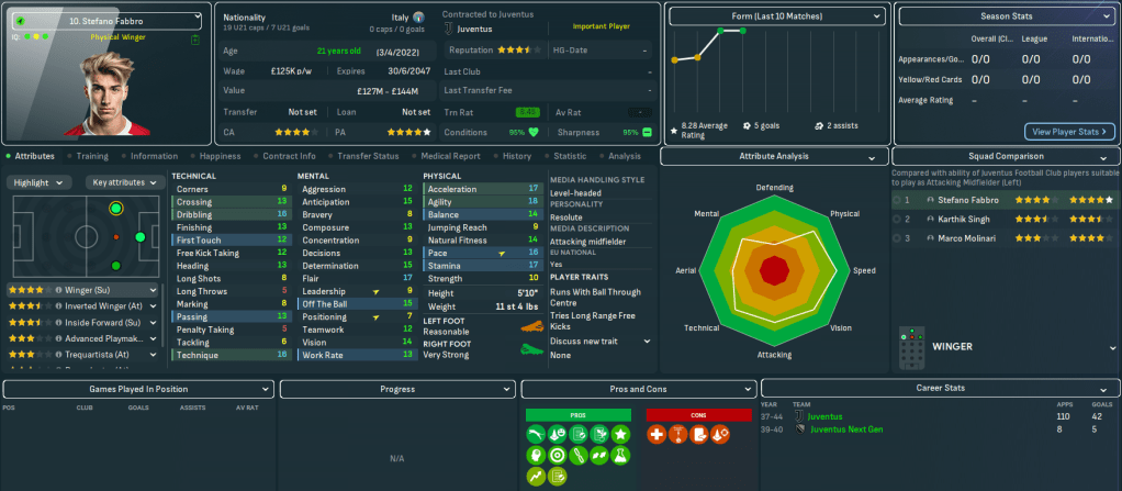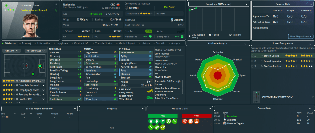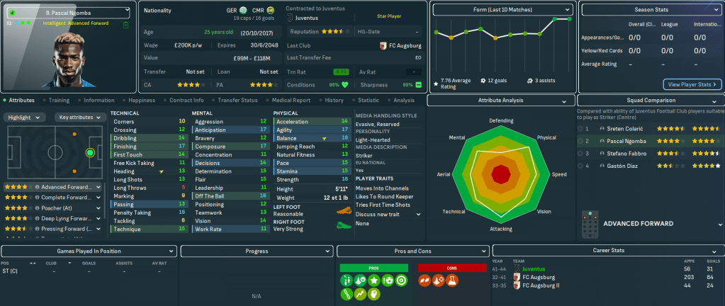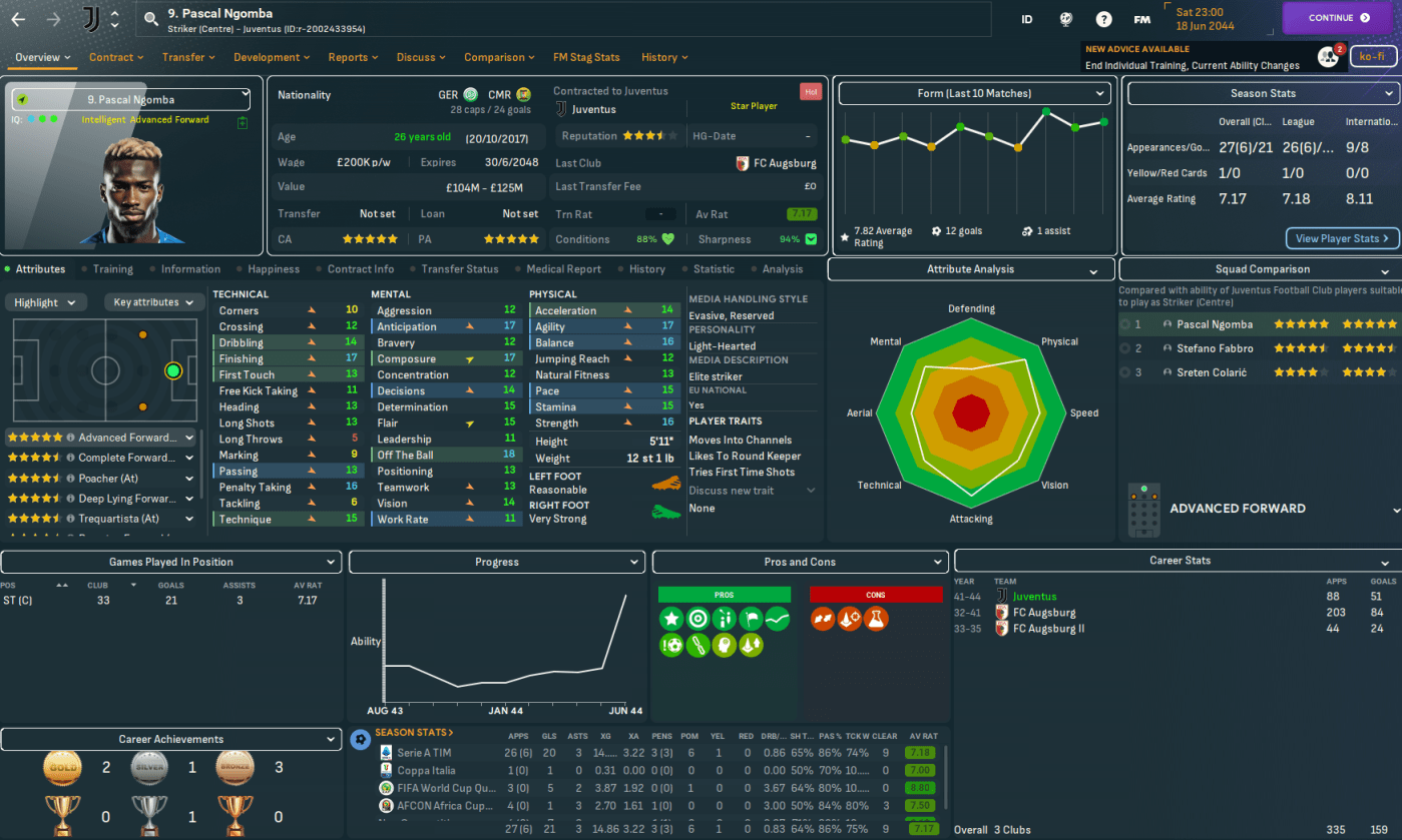 Ngomba finally began to deliver on his ability, scoring a brace in a 3-1 win over city rivals Torino. They stepped up a level to earn a 1-1 at home to Milan then beat Fiorentina 2-0 before finishing the year by crushing Salernitana 5-0 led by another Colaric brace both laid on by Belezyako and Yalcin’s first goal for the club as Ngomba jetted off to the African Nations. That sent Juve into 2044 in a solid 5th place, 7 points above Torino in 8th but a huge 13 behind pacesetters Inter and Roma, for whom Mahtal’s former strike hero Giacomo Cobianchi led Serie A with 16 goals.