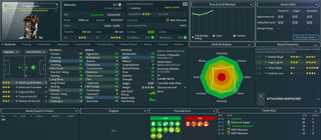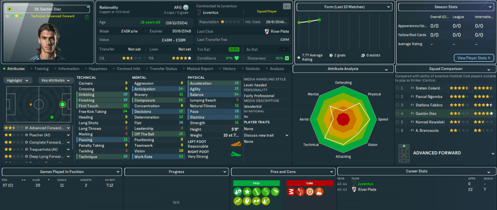 Juve had certainly made progress under Mahtal as, having sold off most of the ageing squad and bedded exciting youngsters into a new formation, he led back into the Champions League and the club’s best finish for four years. And the potential at Juve was proven by Díaz, Bjortuft and Callo coming 8th, 11th and 12th on NxGn 2044. Ngomba led the way with 21 goals in 33 games followed by the impressive Fabbro, who got 12 goals and 9 assists in 34 games, Colaric (11 goals and 6 assists) and Singh (10 goals and 9 assists).