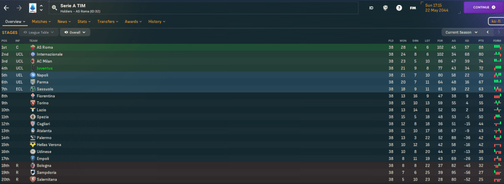 Juventus is the most successful club in the history of Italian football, winning its first national title in 1905 and going on to win 36 league titles, 15 Coppa Italia and two Champions Leagues. However, the club – nicknamed The Old Lady in the 1930s, based on a pun around having an ageing team despite its name meaning youth in Latin – hasn’t won Serie A since 2020 and hasn’t been champion of Europe since 1996. In this save, it’s finished 2nd four times but has yet to win that elusive Scudetto, although it did win the Europa League in 2037 and Coppa Italia in 2024, 2027 and 2035.