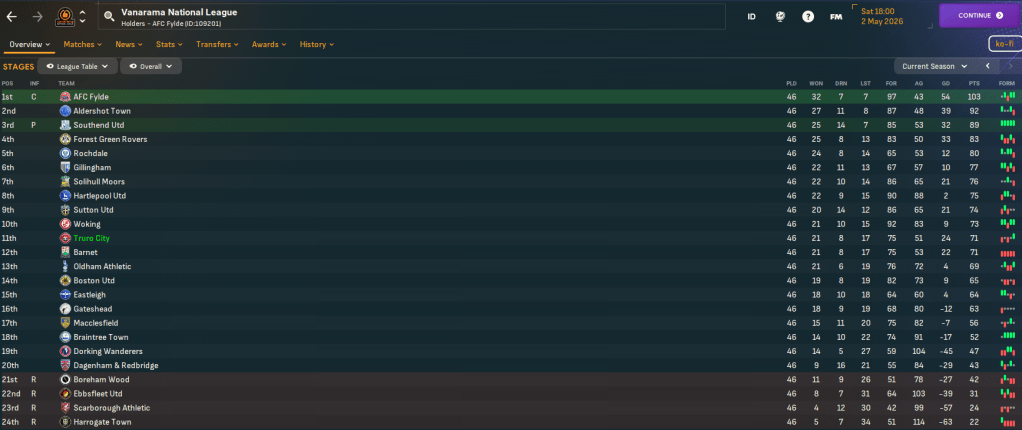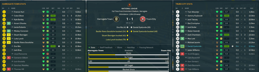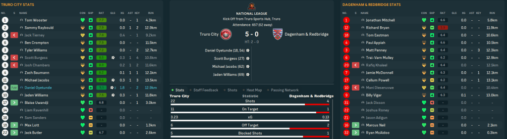 A rare Chambers goal nicked a 1-0 at Macclesfield but a 4-2 defeat at 4th-place Southend dented their outside playoff hopes. And, with the manager and player’s attention very much focused on another matter, Truro consolidated in a solid 11th place, winning 3-1 at Boreham Wood on the final day to relegate them. They finished with 71 points, an impressive 20 more than last season, after 21 wins, 8 draws and 17 defeats, scoring 75 and conceding 51, which was a huge 33 fewer than last season. Jaden was the 6th-top scorer with 17 goals in 39 games, 5 fewer than Southend’s Dom Telford, and Wooster’s 15 clean sheets was the 3rd-most.