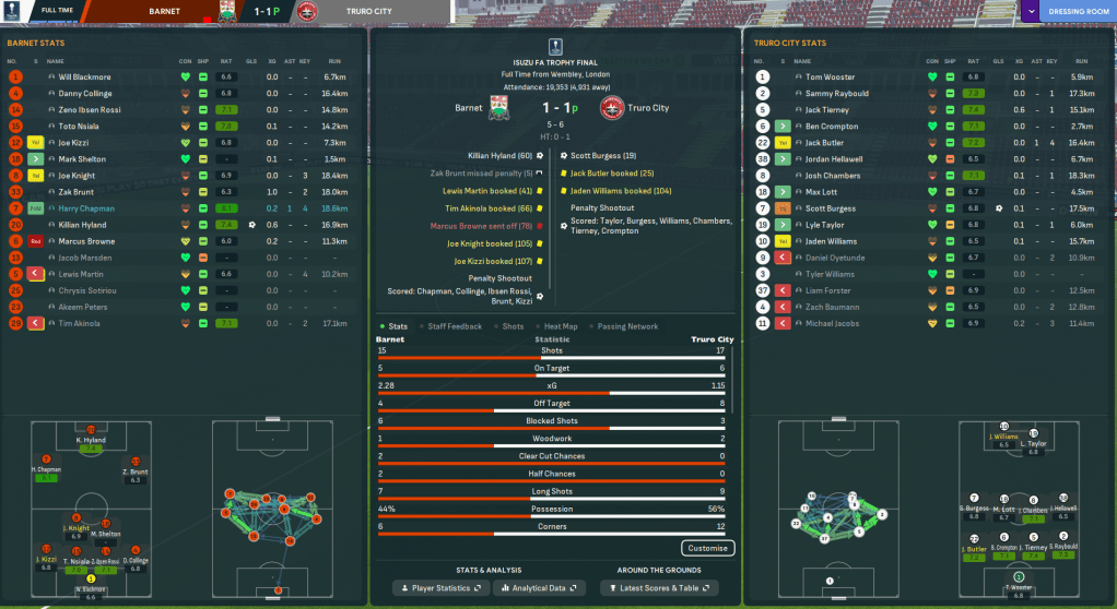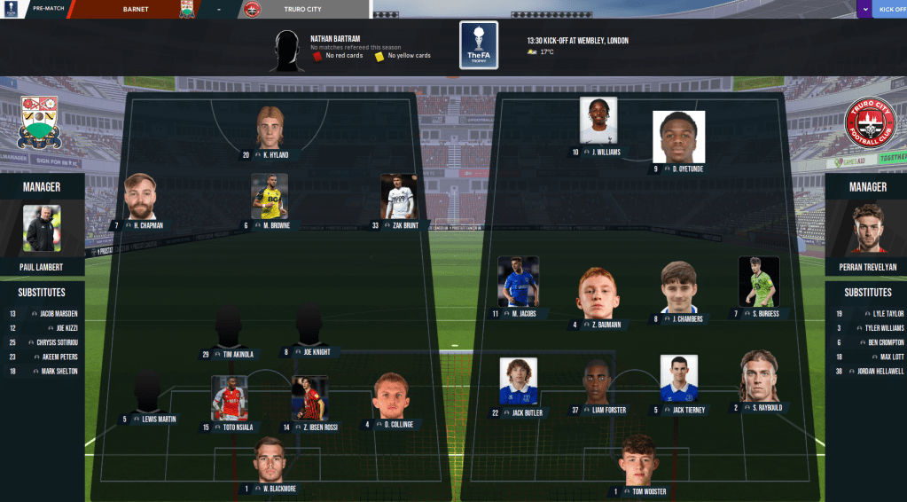 The whole of Cornwall was buzzing for a month between winning the FA Trophy semi final and travelling to the bright lights of London for Truro City’s first-ever trip to the world famous Wembley Stadium. Bizarrely, the National League transfer window opened one week before the big final, so a few players Trevelyan had pre-signed for next season were available for selection – which felt a bit wrong! The big day, which oddly saw only 19,353 people head for Wembley, saw Truro take on Barnet, who’d also never won the FA Trophy but had appeared in two finals. Trevelyan had no injury concerns so he lined up: