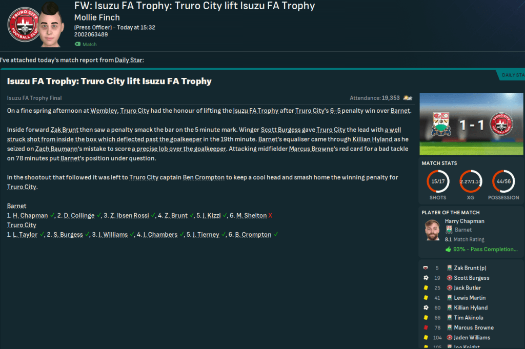 Trevelyan was absolutely loving life at his hometown club as they celebrated a big day out at Wembley by winning the FA Trophy. This was a big sign of the progress Truro was making as they consolidated their position as a mid-table National League side and won some silverware.