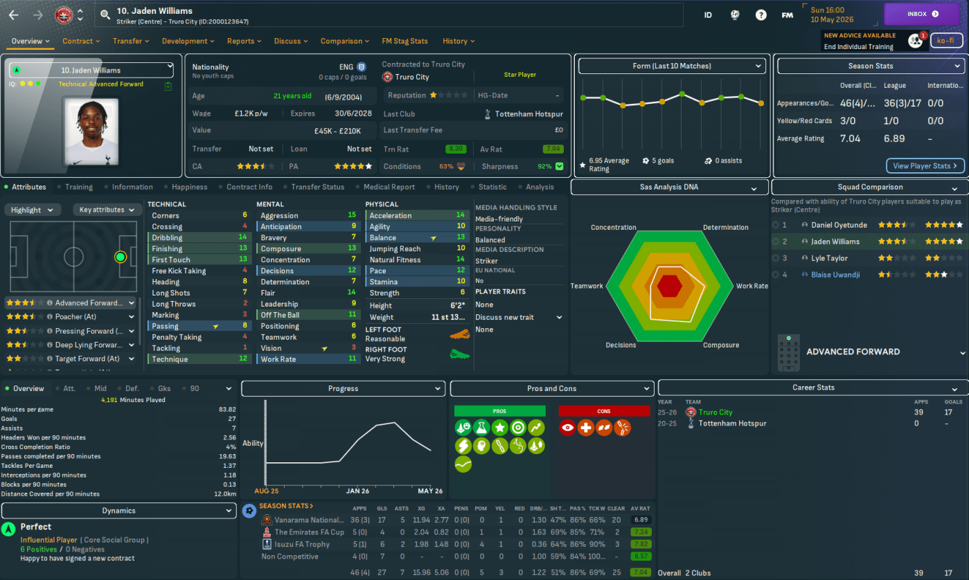 A tired Truro team began 2026 with 1-0 defeats at Sutton and at home to Gillingham then losing 2-1 at 2nd-place Rochdale. That extended to an eight-game winless streak, which dropped them 11 points off the playoffs, before beating Barnet 3-1. A rare week off gave Trevelyan a chance to rest players and they repaid him by dominating Dorking 5-1, put four past Eastleigh and then won 4-1 at struggling Ebbsfleet led by an Oyetunde brace. And Tierney’s pair of headers at home to 7th-place Solihull gave Truro a faint hope of making the playoffs, trailing them by 5 points with six games remaining.