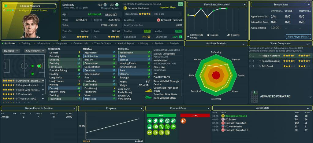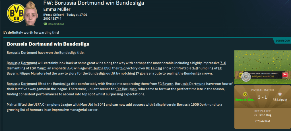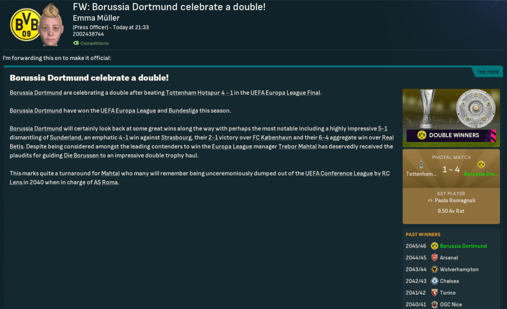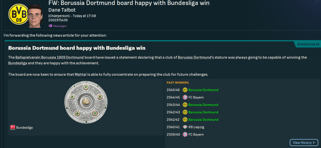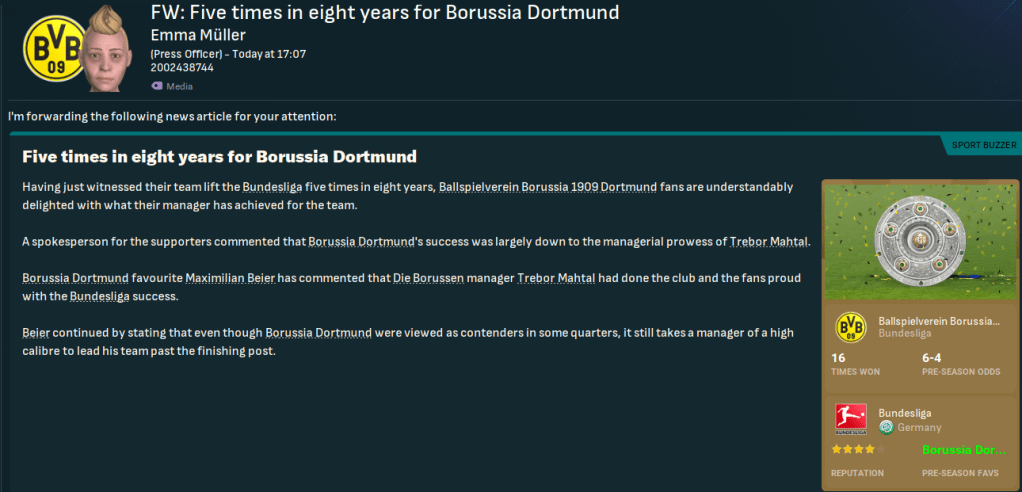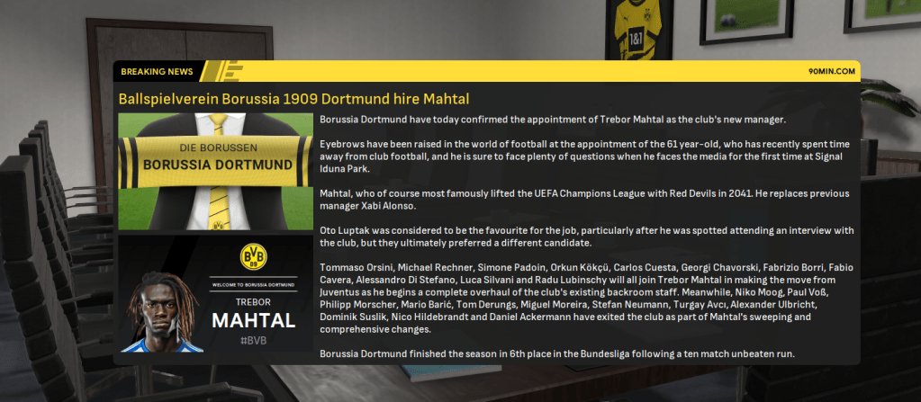 Upon resigning, Borussia Dortmund and Valencia were the most eye-catching vacancies. Dortmund made the first move to offer an interview, swiftly asked Mahtal for his staff changes and made him an offer before anyone else had a chance. So, on 20 June 2045, Mahtal was heading back to Germany.