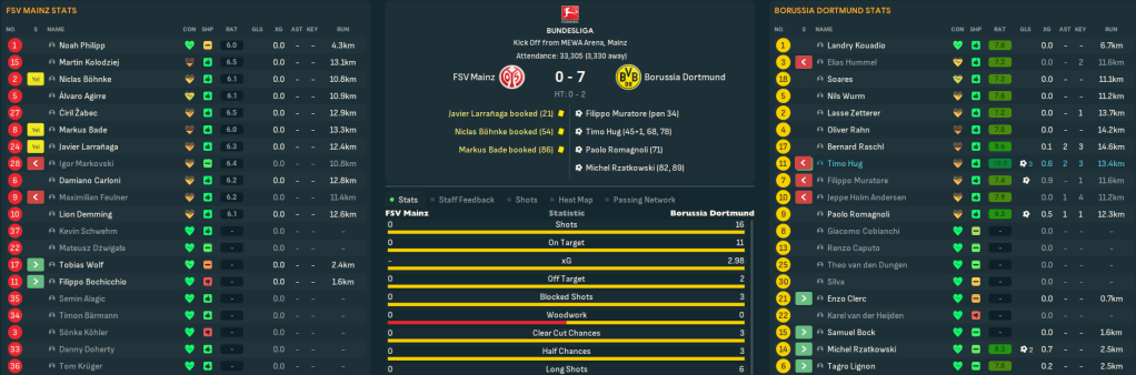 Mahtal’s first game back in Germany for eight years was a trip to newly promoted 1860 Munchen. A pretty lax defensive effort was rescued by debutant laying on goals for Romagnoli and Andersen either side of scoring a long-range effort to inspire a 3-2 win. A much more convincing performance followed on Mahtal’s home debut as Holm Andersen ran the show with a goal and an assist in a 3-0 win over Koln, then scored the opener in a comfortable 3-1 win over Leipzig. That strong start continued, including Romagnoli’s hat trick and a Muratore brace leading a 6-0 hammering of Mainz, while Bayern were lingering down in 10th ahead of Mahtal’s first taste of Der Klassiker. Romagnoli’s fine start continued as he headed the opener on 8 minutes and Bayern were down to 10 men for a shocking challenge on half an hour. Muratore headed a second against the team he was on loan at last season and Holm Andersen swept in a third just after halftime, then made it ten a side before Bayern got another straight red! But Dortmund settled for a huge 3-0 win at their rivals.
