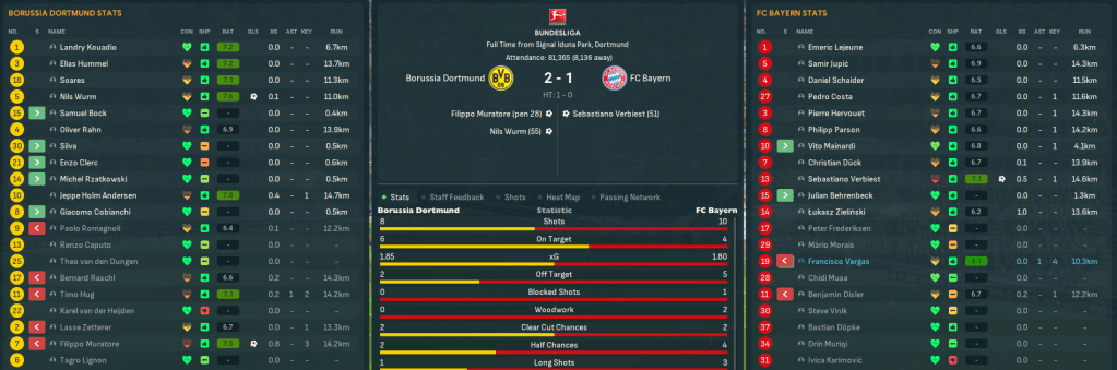Game 2 – Schalke (10th, home): Next up was a Rhein Derby clash and Muratore’s near-post flick from Hug’s cross earned a 1-0 win. Bayern won 3-0 again.