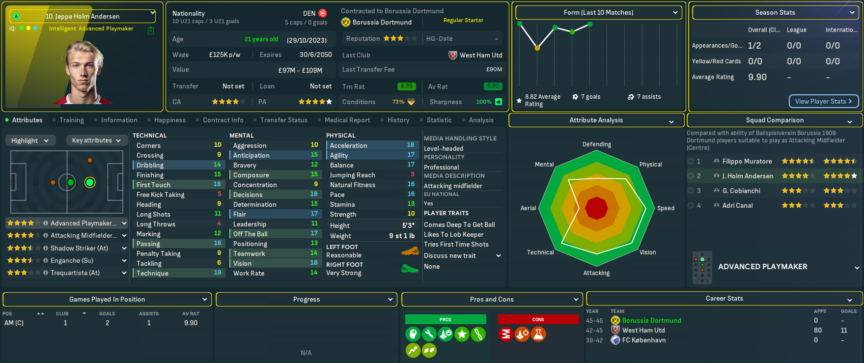 The huge sales gave Mahtal a massive £300m to work with. He made his former West Ham midfielder Jeppe Holm Andersen his top target and got the deal done for up to £90m. Another familiar face arrived as former Roma striker Giacomo Cobianchi made the move for £15m. They were joined by winger Enzo Clerc for £59m from Monaco, centre back Theo van den Dungen for £45m from Milan, promising midfielder Silva for £16m from Mineiro and goalkeeper Renzo Caputo for £7.5m from Independiente. And, despite spending £200m, he still had £132m in the transfer budget!