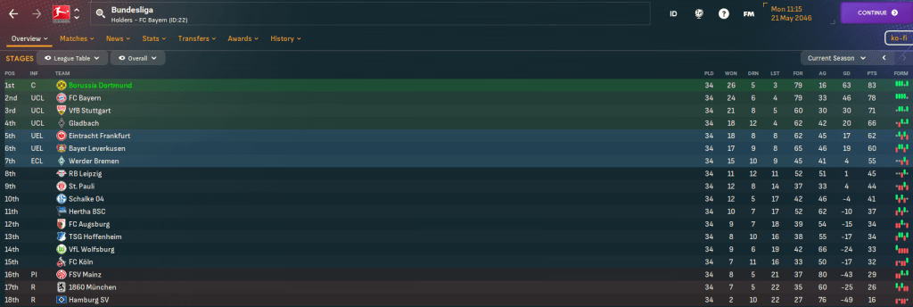 Dortmund began 2046 with Hug creating both goals in a solid 2-0 win at home to Werder Bremen before early Holm Anderson and Raschl goals earned the same result at Leipzig. The impressive defensive strength continued as they racked up seven successive clean sheets while the impressive Hug racked up ten assists in six games, including a hat-trick and two assists in a 7-0 thrashing of Mainz. They then entertained Bayern, who’d clambered back up to second, and led through Muratore’s penalty. Bayern equalised just after halftime, but Wurm swiftly nodded his side back in front and they held on for a 2-1 victory that opened up a 10-point lead.