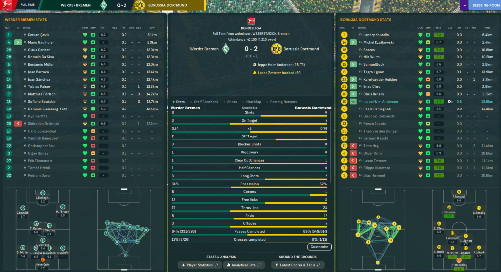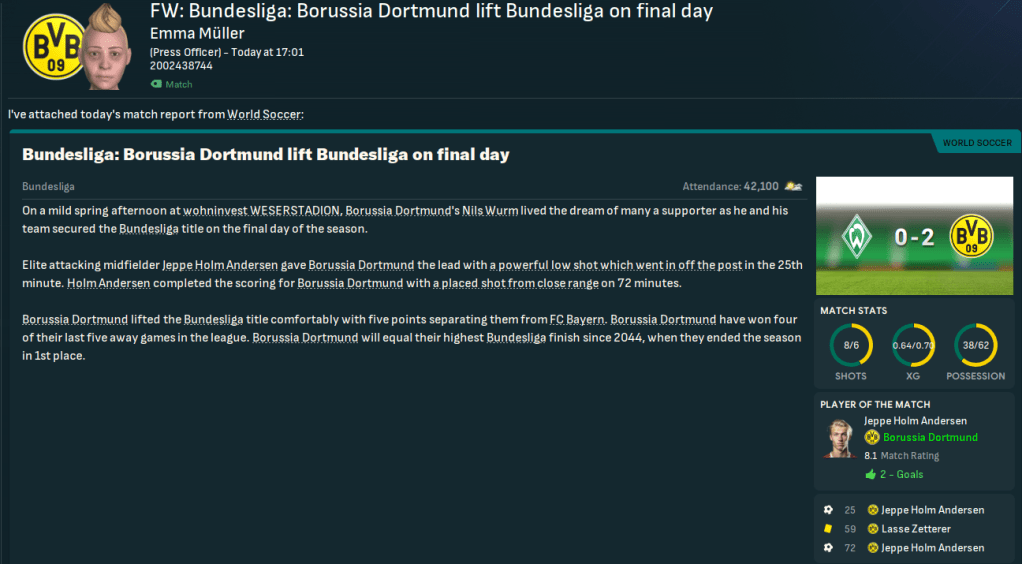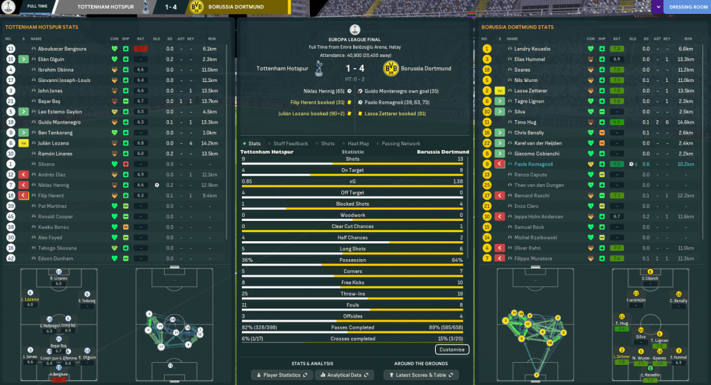 The positive of Dortmund’s poor previous season was that they were among the favourites to win the Europa League. They got an easy set of group fixtures so Mahtal heavily rotated the side, and they squeezed through in 6th with five wins and three draws. Mahtal celebrated 900 games in football management with a 3-2 win at home to Real Betis, which sent them through 6-4 on aggregate. They eased past Sunderland in the quarters and beat Lens 3-0 on aggregate to reach the final. Dortmund also cruised through the DFB-Pokal to face Nurnberg in the semis. Mahtal fully rotated and young winger Chris Benally nicked a 1-0 win to tee up a Der Klassiker final.