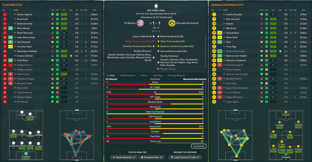 There was no time for celebrations as four days later, Dortmund returned to face Bayern at Olympiastadion Berlin. The team was exhausted despite a day of rest, and it showed as they conceded Bayern’s first shot after 8 minutes before Holm Andersen wasted two good chances. Mahtal made a mass of changes and it worked as winger Michel Rzatkowski headed a deserved equaliser on 81 minutes. Two exhausted teams played out a poor extra time and it went to penalties. Both teams scored their first 9 penalties, including Kouadio scoring one, before Soares, who was always a concern considering he was taking a penalty after his goalkeeper, missed and Bayern secured the cup.