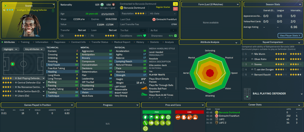 Mahtal’s rebuild continued in January 2046 as he sold two more backup players for £66m – taking his sales to £268m in six months! He also turned down a £120m bid for Rahn from Man United and derisory Bayern bids for Muratore and Romagnoli, who he absolutely not be selling to Bayern. He strengthened a threadbare defence with his former Frankfurt centre back Soares, now 28, for his £78m release clause and signed promising midfielder Karel Van der Heijden for £23.5m from Ajax.