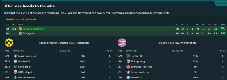 Game 1 – Leverkusen (6th, away): The run-in began with a potentially tricky away day, but Dortmund dominated by 19 shots to 4 and two more Hug assists inspired a 3-1 win. Bayern won 3-0 at Hertha to keep the gap at 5 points.