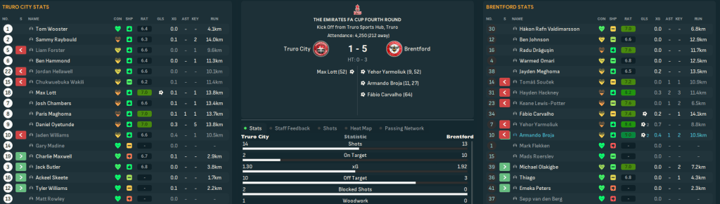 That win set a new gate receipts record of £80k, less than the £107k for reaching the fourth round for the first time. Another annoying draw followed at home to Brentford, and they unsurprisingly lost 5-1 – but the game was on live TV, earning a bit more money. Brentford went on to reach the semis, only losing to Arsenal on penalties. However, Truro’s FA Trophy defence didn’t go well as they lost on penalties to Forest Green in the fourth round.