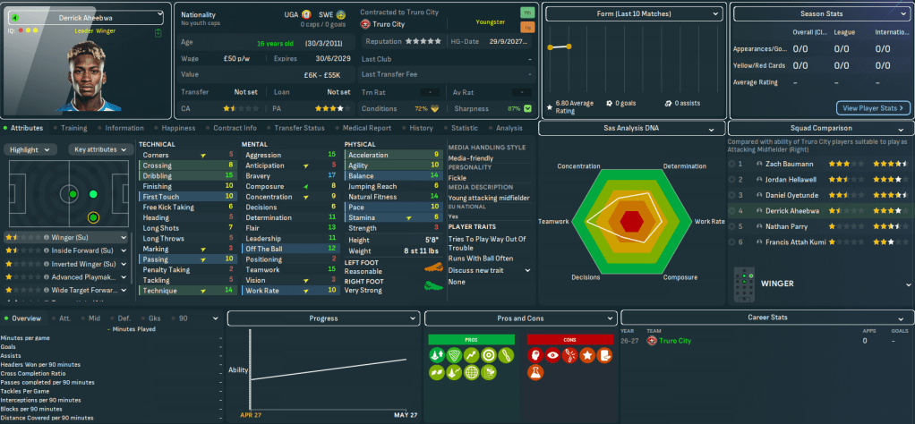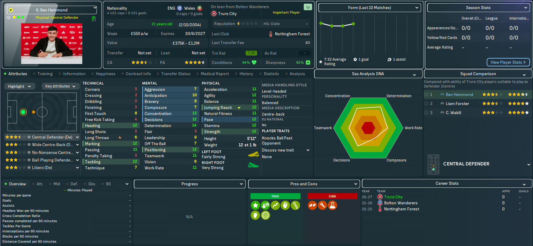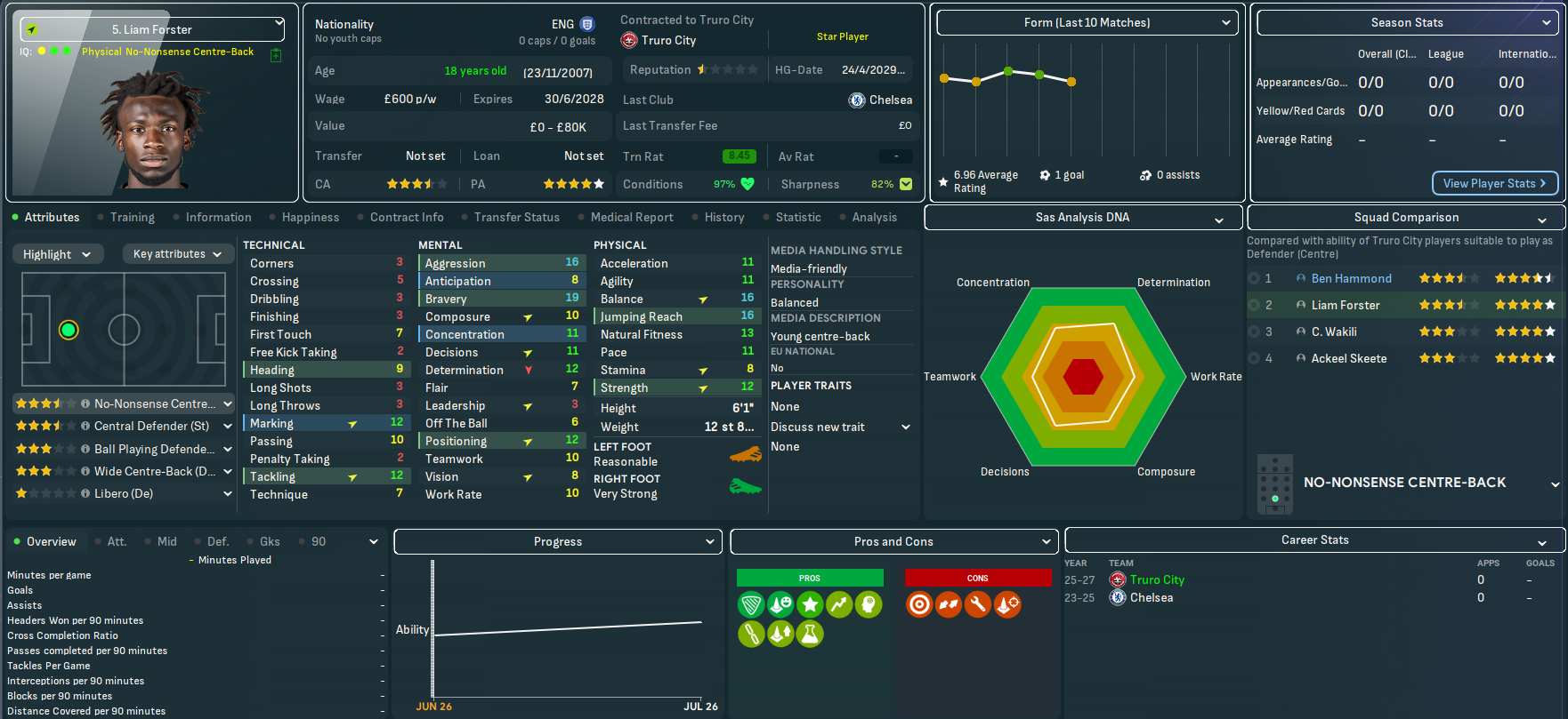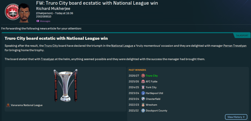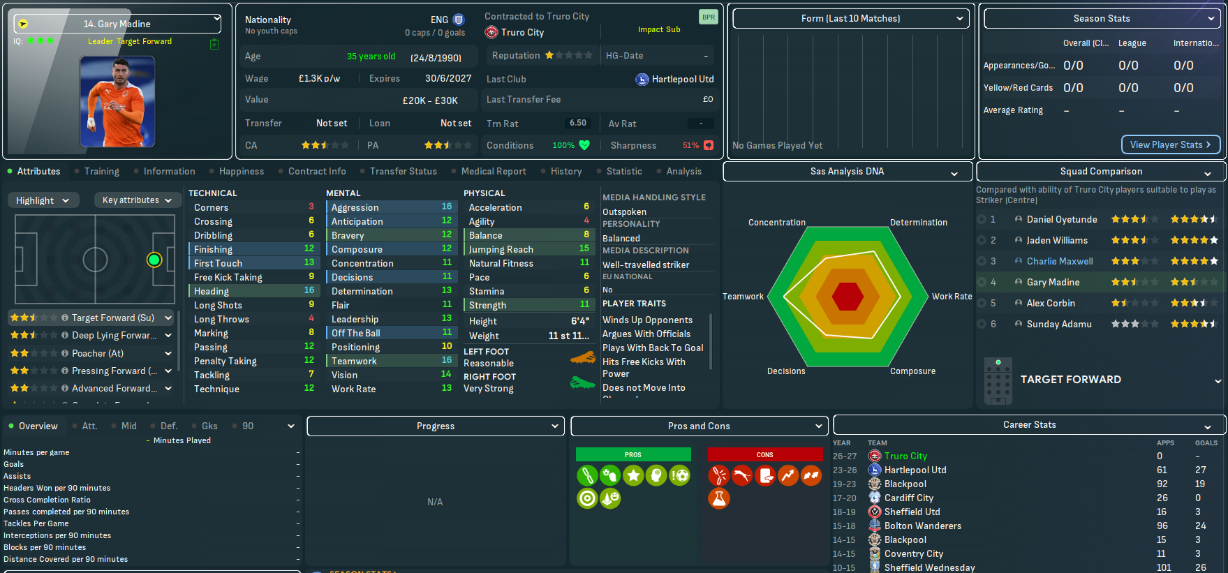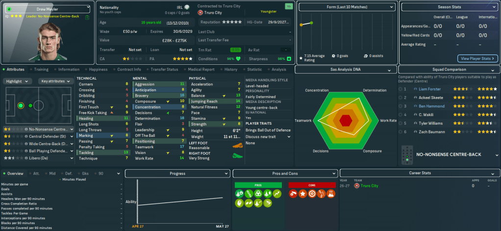 Another summer rebuild was in store as Truro bid farewell to retiring striker Lyle Taylor and winger Michael Jacobs, while Scott Burgess, who’d contributed 42 assists in the last three seasons but wasn’t good enough for this level, Wembley penalty hero Ben Crompton and 15 youngsters were released. The good news was tycoon owner Richard Mukherjee had given him a wage budget hike to £17k per week and a transfer budget of £190k, with £783k in the bank coming into the 2026/27 campaign. However, they soon lost star defender Jack Tierney to Stockport for a club record £29,500.
