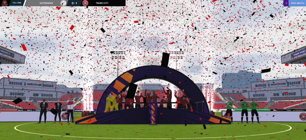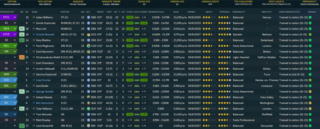 Trevelyan was beyond delighted with the efforts of his young squad. They’d defied all expectations to take the National League by storm and win the title on the final day. Jaden again led the goalscoring chart with 25 goals and 6 assists in 51 games, but really struggled at the end of the season, while Oyetunde scored 16 with 9 assists in 40 games. But a surprise star man was Lott, who scored 13 with 13 assists in 50 games, along with Maghoma’s 6 goals, 13 assists and club-high 7.19 average rating.